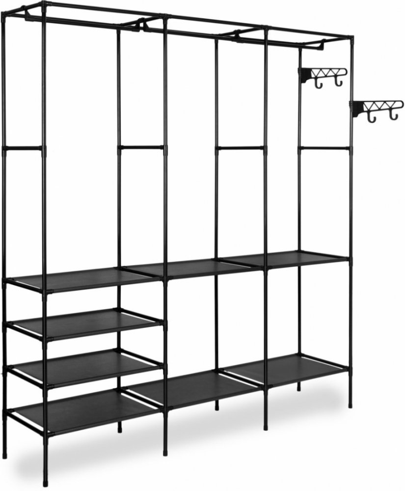 Ocelové trubky s černým práškovým nástřikem jsou k sobě pevně spojené plastovými konektory, a tak je konstrukce skříně velice stabilní a pevná. Šatní skříň má osm polic, které jsou vyrobené z voděodolného laminovaného materiálu. Tento materiál je pevný a lze ho velice snadno udržovat v čistotě. Police jsou vhodné pro uložení oblečení, bot, ručníků či ložního prádla.