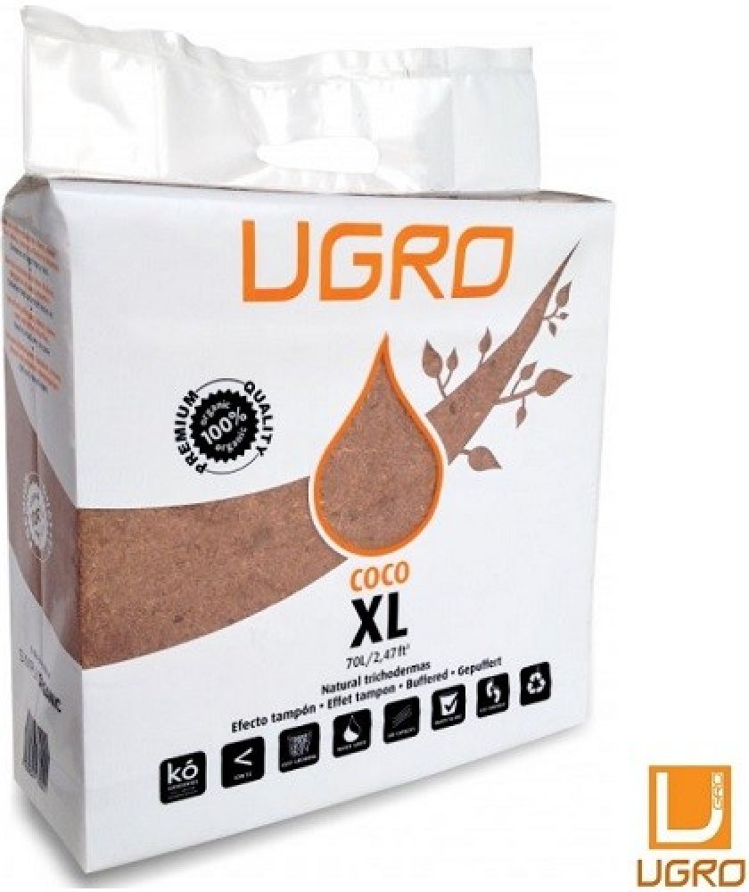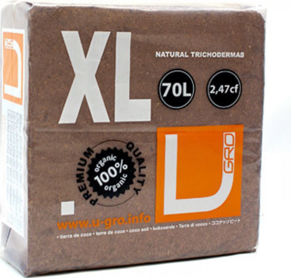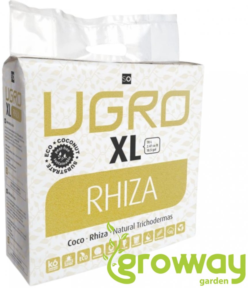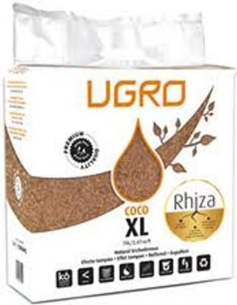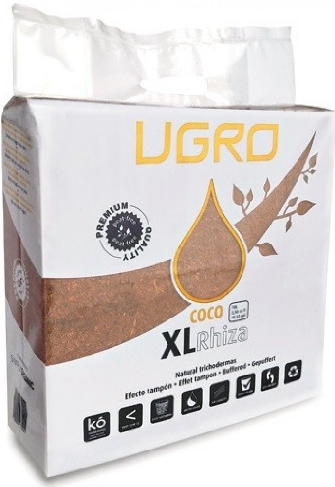 U Gro RHIZA XL je 5 kg vážící cihla z lisované rašeliny a dehydratovaného kokosu z malých částic s nízkým procentem vláken, smíšené s endomycorrhizae (5%).