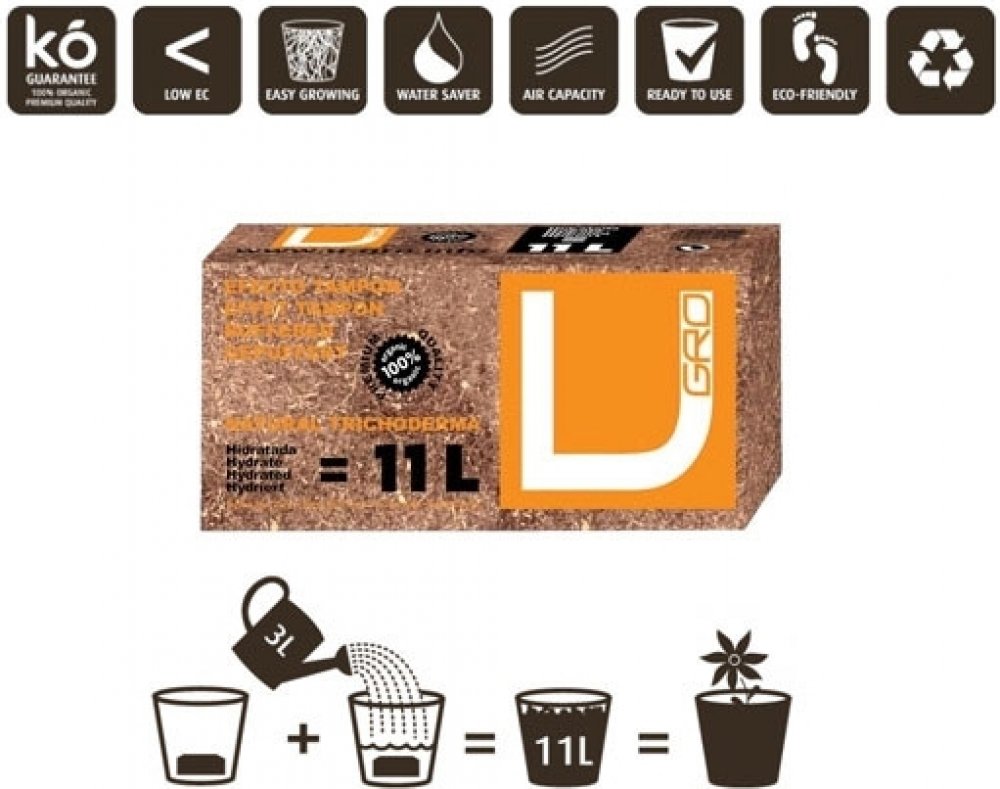 • Je vhodný pro všechny typy pěstování, jak ve venkovním prostoru tak uvnitř. Pěstební substrát U-Gro Brick - lisovaná kokosová briketa s trichodermou - 11 l