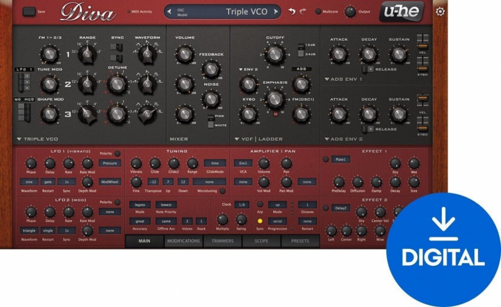 Diva zachycuje ducha pěti desetiletí analogových syntezátorů. Oscilátory, filtry a envelopes od některých z největších monofonních a polyfonních syntezátorů minulosti byly pečlivě modelovány pro bezkonkurenční analogový zvuk. Více než jeden syntezátor: Vytvořte si staré oblíbené nebo smíšené moduly a navrhněte svůj jedinečný hybrid.