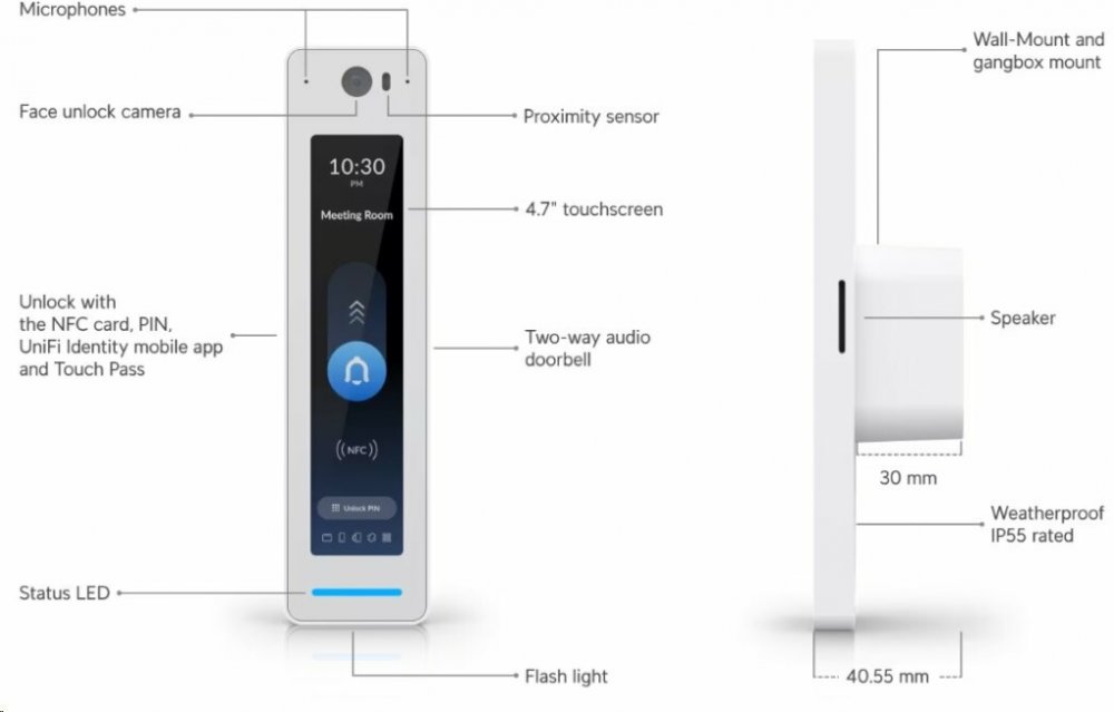 Ubiquiti G3 Reader Pro je třetí generací přístupových čteček, která podporuje autorizaci NFC kartou, Apple Touch Pass *, mobilní aplikací UniFi Identity, obličejem nebo číselným kódem. Díky funkci zvonku, kameře a zabudovanému obousměrnému audiu lze komunikovat s návštěvou. Certifikace IP55 zajišťuje možnost použití ve venkovním prostředí.