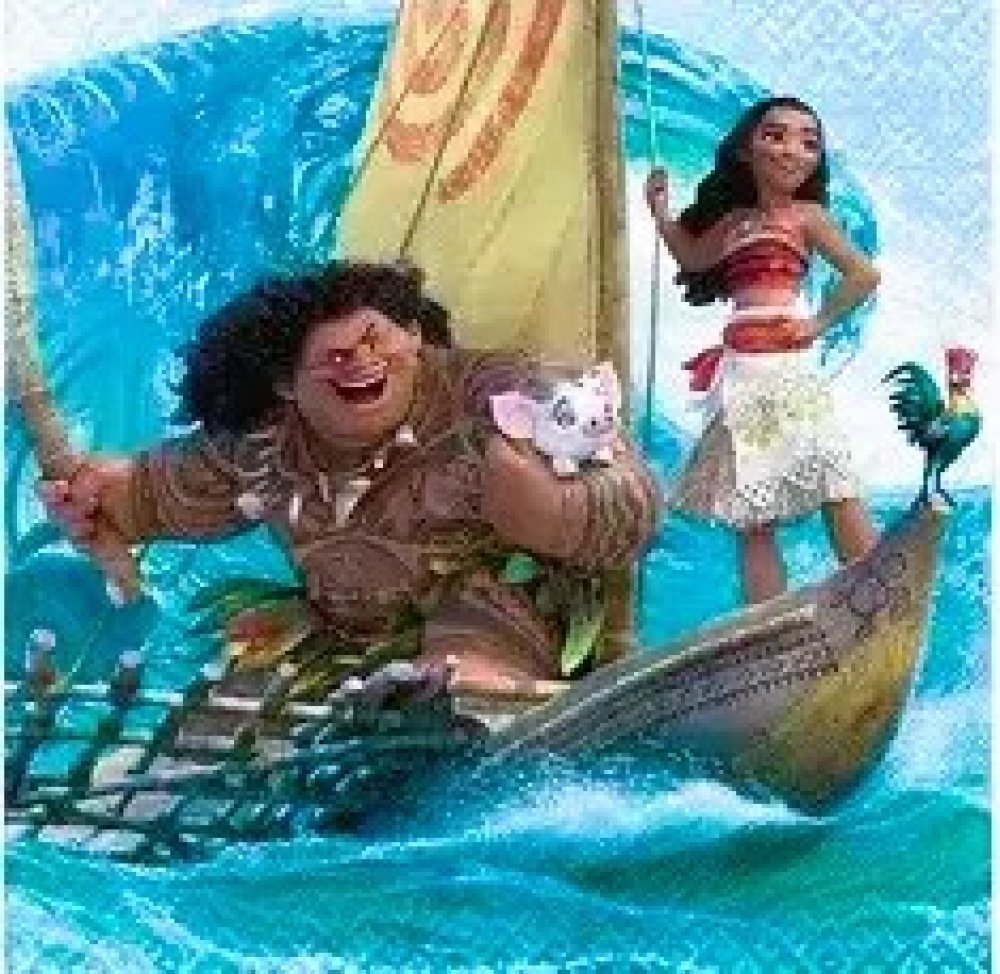 Papírový ubrousek s motivem Moany – odvážné hrdinky z oblíbeného Disney filmu. Motiv je vytištěn na jedné čtvrtině ubrousku, což jej činí ideálním pro decoupage i jako tematickou dekoraci na dětské oslavy.