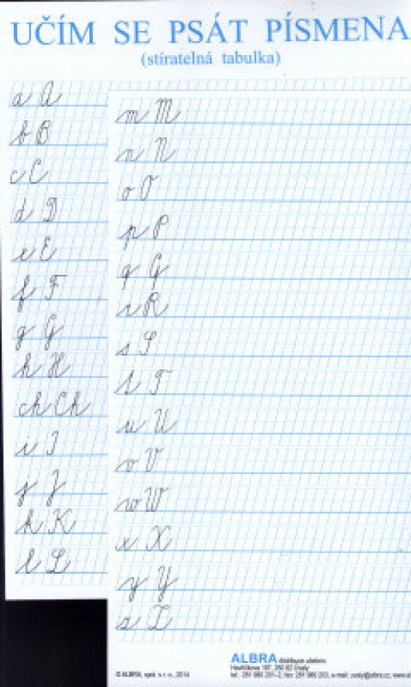 Publikace: Učím se psát písmena - Stíratelná tabulka (psací písmo, velké a malé abc, A4) - neuveden. Stíratelná tabulka A4 : - psací písmo - velká abeceda - malá abeceda K popisování můžete využít např. stíratelné značkovače Centropen 2507 Publikace: Učím se psát písmena - Stíratelná tabulka (psací písmo, velké a malé abc, A4) - neuveden.