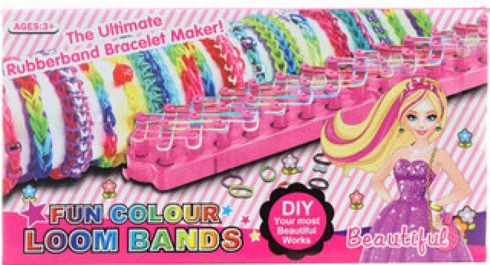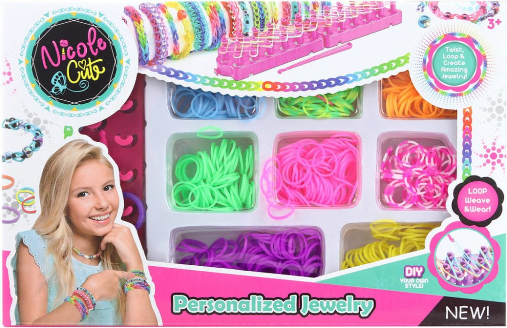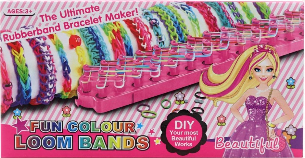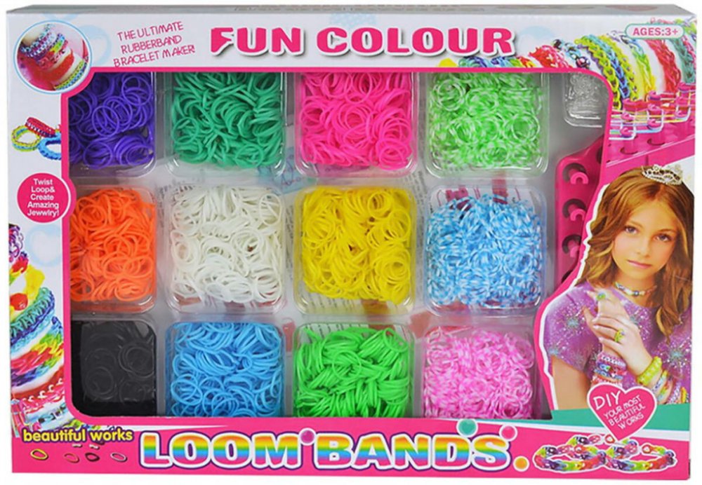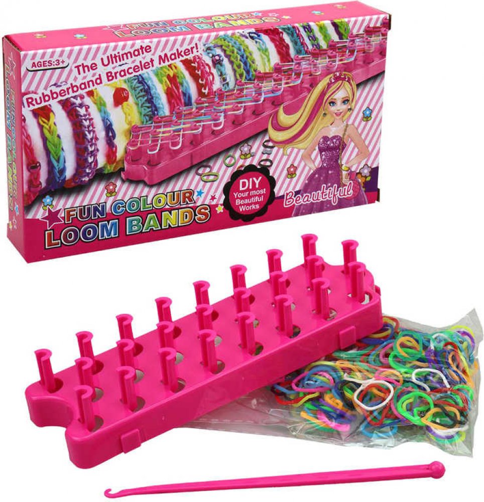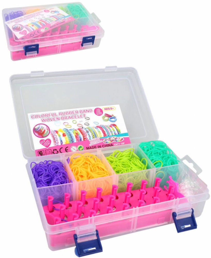 Obsah balení: 700 silikonových gumiček různých barev, třířadý tkalcovský stav, pomůcka na provlékání, háček, 20 uzávěrů (svorka "S"), barevné korálky, kreslený návod