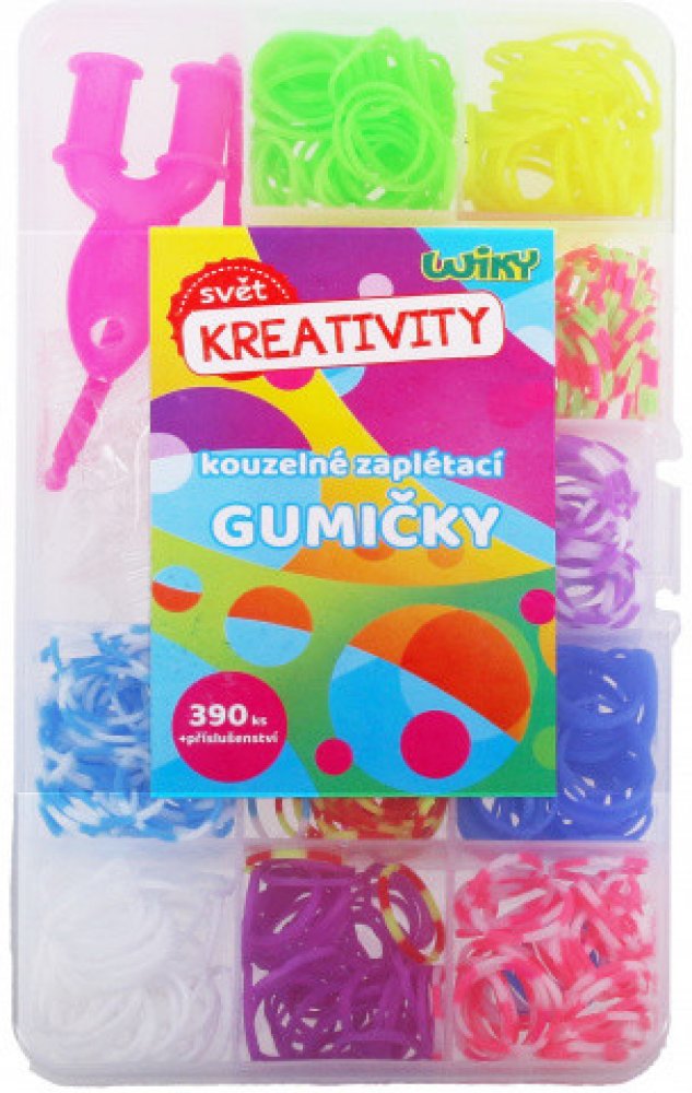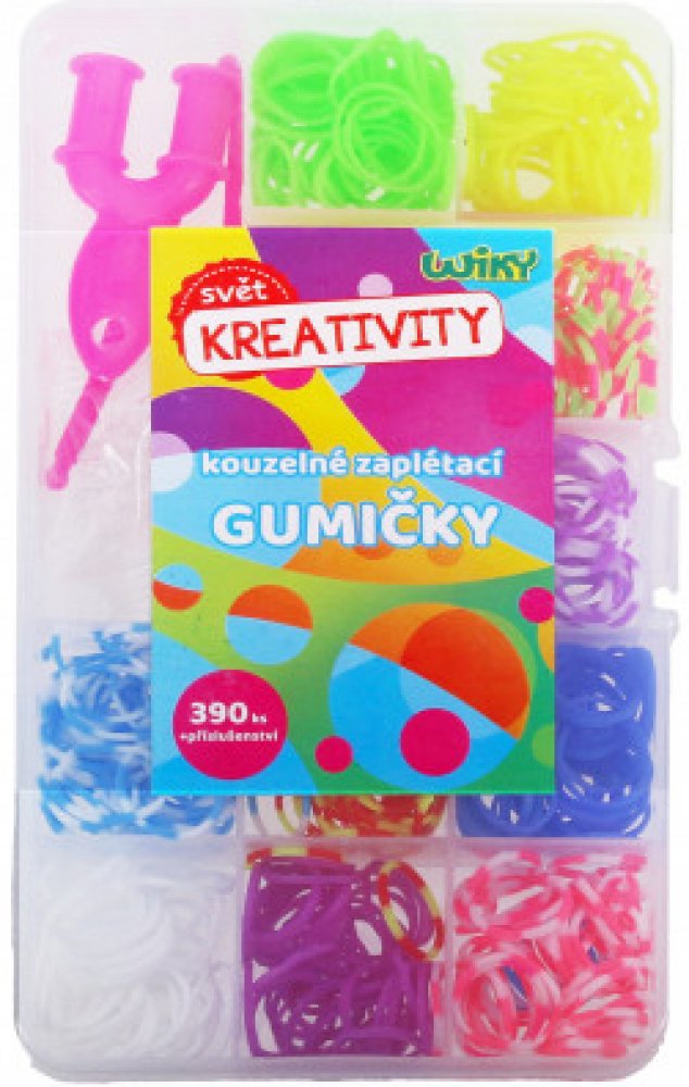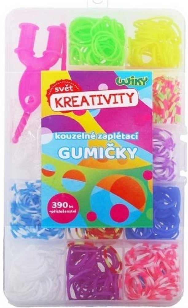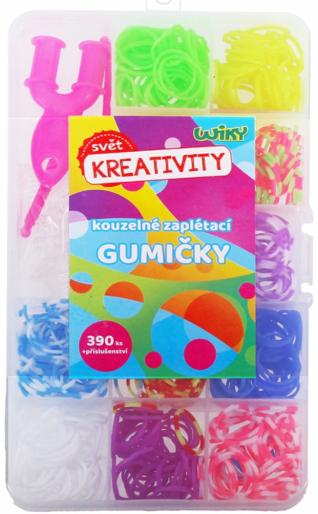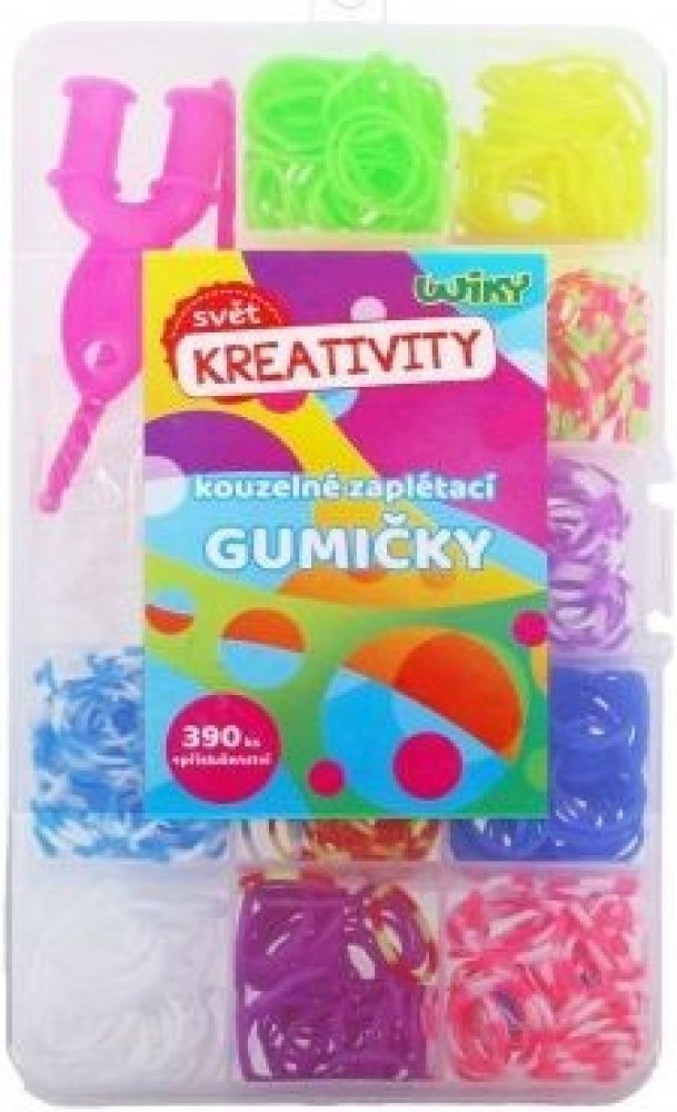 Gumičkománie je opět tady. Kdo by nechtěl si vlastnoručně vyrobit krásné barevné náramky z gumiček. Je to úplně jednoduché. Skvělá zábava pro volné chvíle. Vytvořte si šperk vskutku originální, který nebude mít nikdo jiný! Kouzelné zaplétací gumičkyV balení naleznete:390 ks gumiček - mix barev,2x háček na pletení,svorky k zakončení,pletací mini stav.