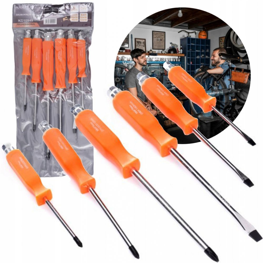 • 3× křížový šroubovák: • PH3 × 8 × 150 mm • PH2 × 6 × 100 mm • PH1 × 5 × 75 mm • 3× plochý šroubovák: • 8 × 150 mm • 6 × 100 mm • 5 × 75 mm