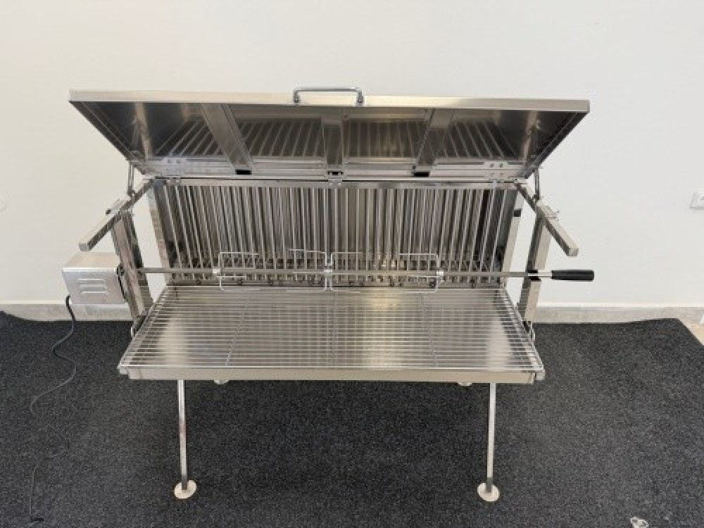 Pod otočným rožněm je umístěna odnímatelná nerezová vana s madly a nerezovým roštem 100 x 34 cm na kterém