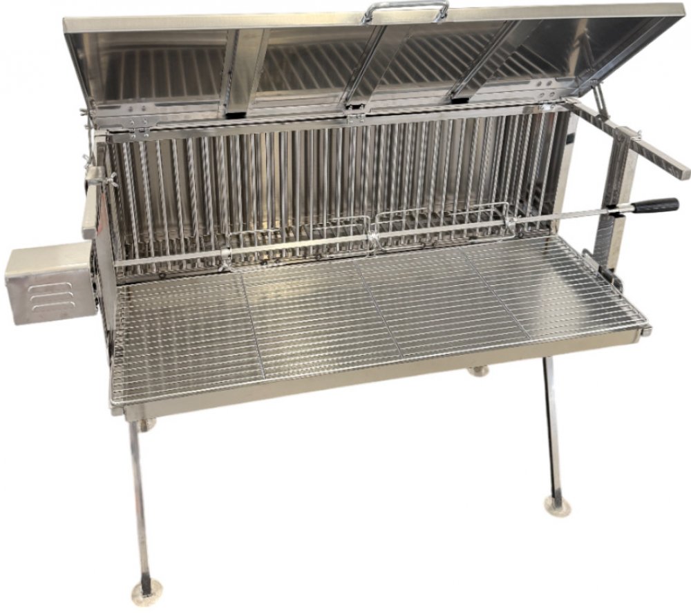 Perfektně řešený velký nerezový gril na dřevěné uhlí a brikety pro rožnění - grilování