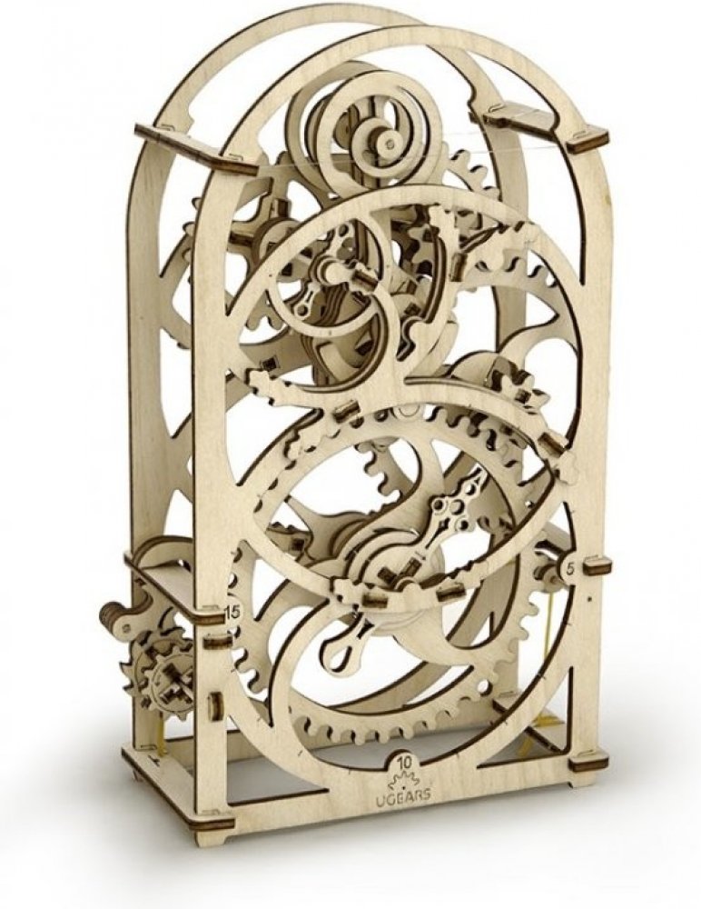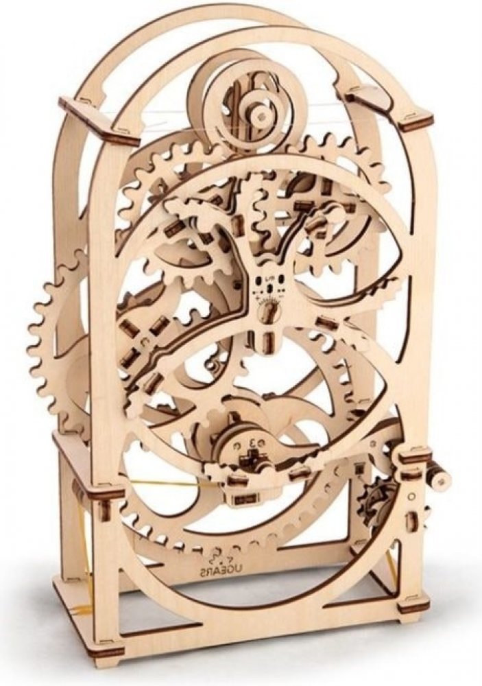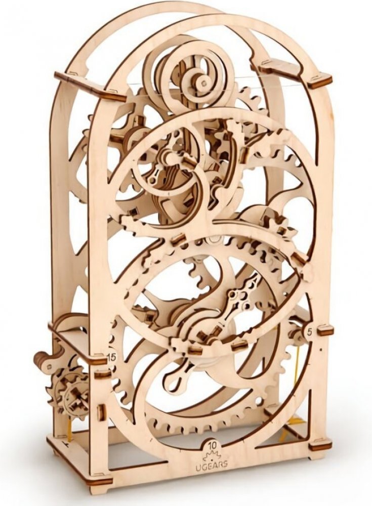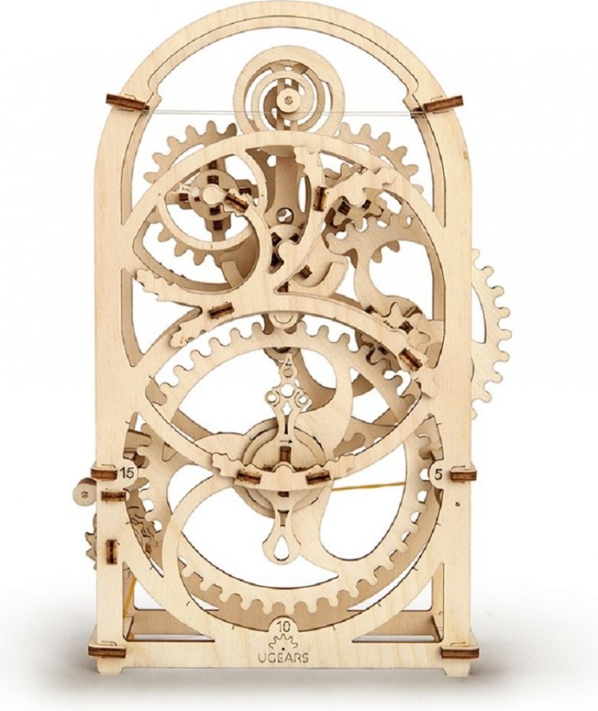 Ugears 3D dřevěné mechanické puzzle Hodinový strojek Stavebnice hodinového strojku, využitelného jako tzv. minutky, vyrobená z překližky. Na stroji podobou spřízněného s hodinami ve skleněných báních můžete obdivovat chod celého mechanismu. Snadno se necháte meditativně unést atraktivně zpracovaným kyvadélkem a jemným klapáním.
