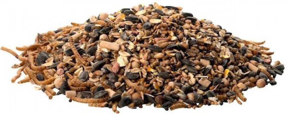 Složení: proso seté, oves loupaný, slunečnice, pšenice, hrách, kukuřice, řepkový extrahovaný šrot, mouka z moučných červů, bramborový protein, mycoprotein, vápenec, methionin, ovesné vločky, hovězí lůj, arašídy, řepkový olej, uhličitan vápenatý, kalcit, rozinky, jeřabiny, moučný červ sušený, kukuřice, řepka.