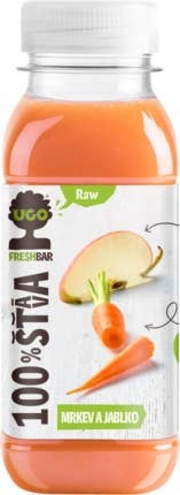 -- 100% šťáva z čerstvé mrkve a jablek. Štáva je lisovaná za studena, ošetřena vysokým tlakem. V UGO lahvičkách najdete nepasterované 100% ovocné a zeleninové šťávy v raw kvalitě. Díky šetrnému ošetření vysokým tlakem (paskalizací) si zachovají chuť…