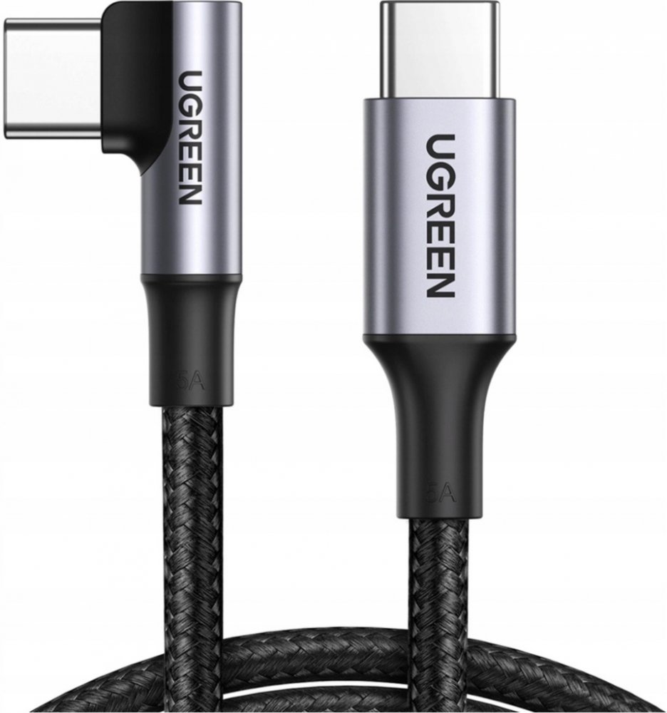 Kabel Ugreen US334 70643 USB-C (úhlový) / USB-C (rovný) 100W PD 1mKabel Ugreen US334 70643 s konektory USB-C (úhlový) na USB-C (rovný) o délce 1 m - černý
