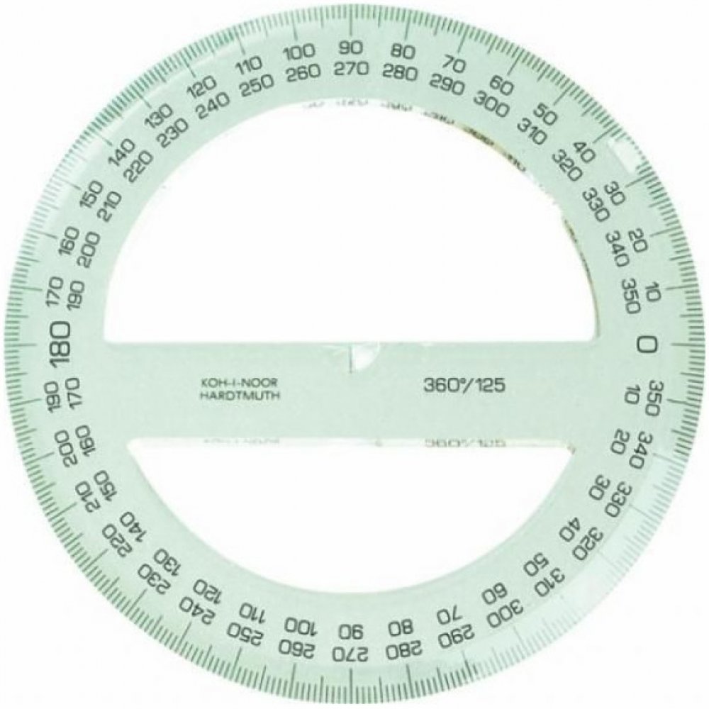 Úhloměr 360°, kulatý, šířka 12,5 cm vyrobený z čirého průhledného polystyrenu.