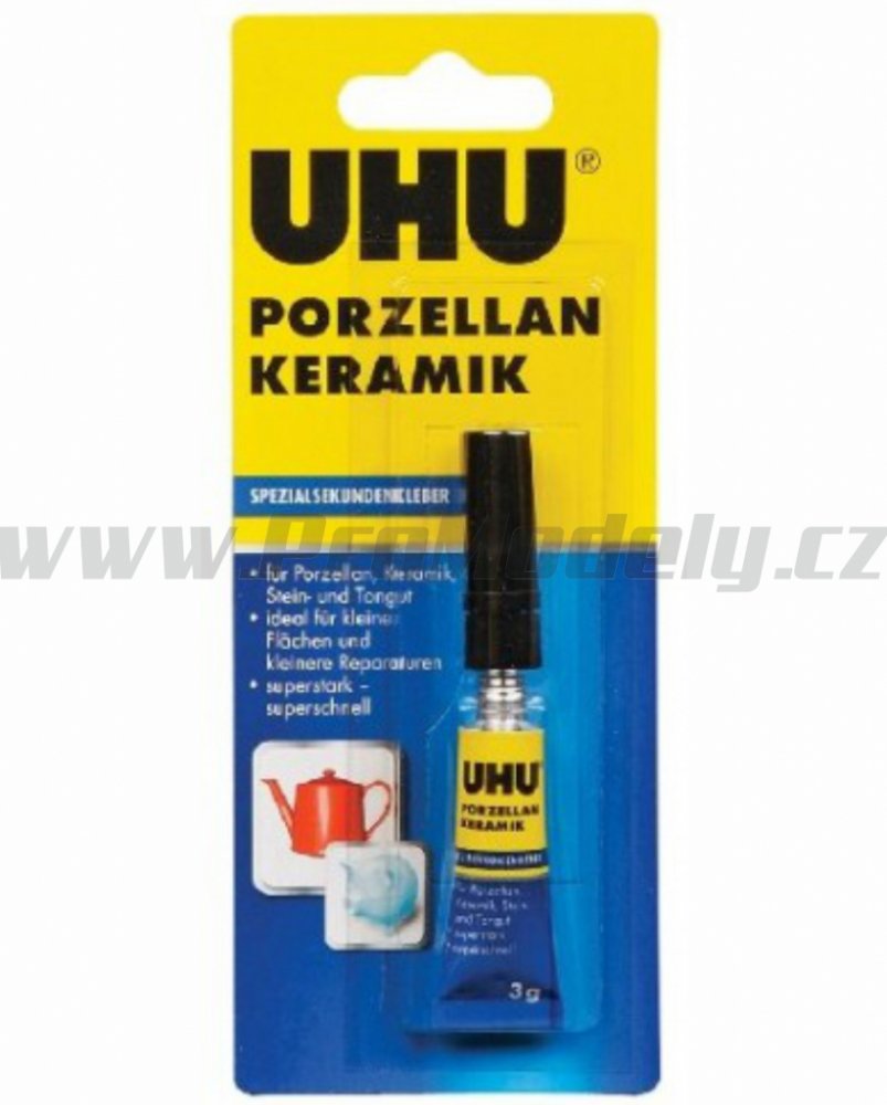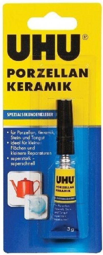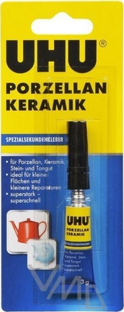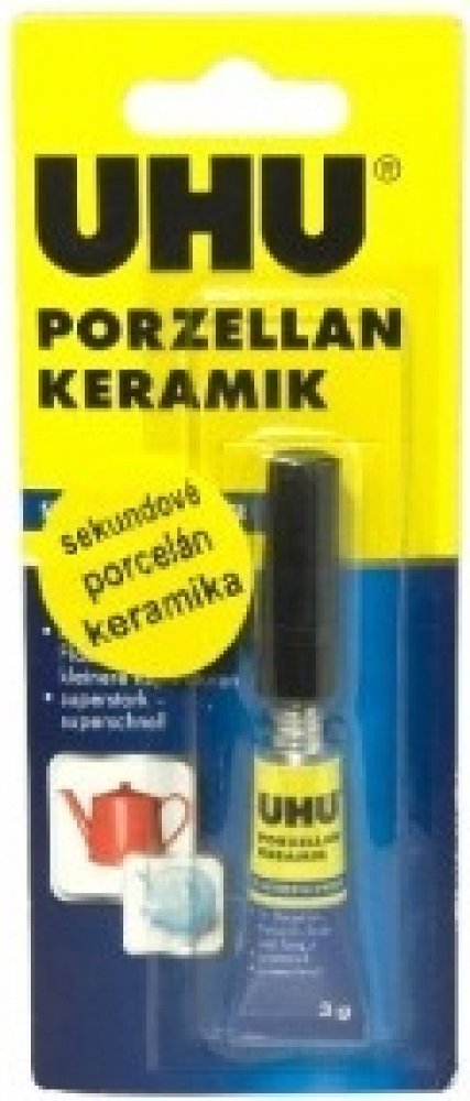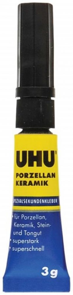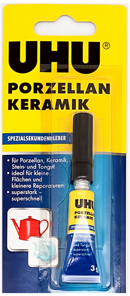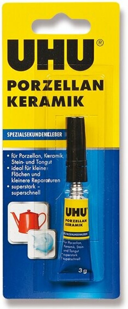 Vteřinové lepidlo na porcelán a keramiku je velmi účinné kyanoakrylátové lepidlo vhodné i pro lepení kamene či hliněných nádoba je ideální pro lepení a opravy malých ploch. Lze použít i pro lepení keramiky s jinými materiály. UHU SEKUNDENKLEBER Porzellan není vhodné na PP, PE a teflon. Lepené části musí být suché, odmaštěné a musí k sobě přiléhat.