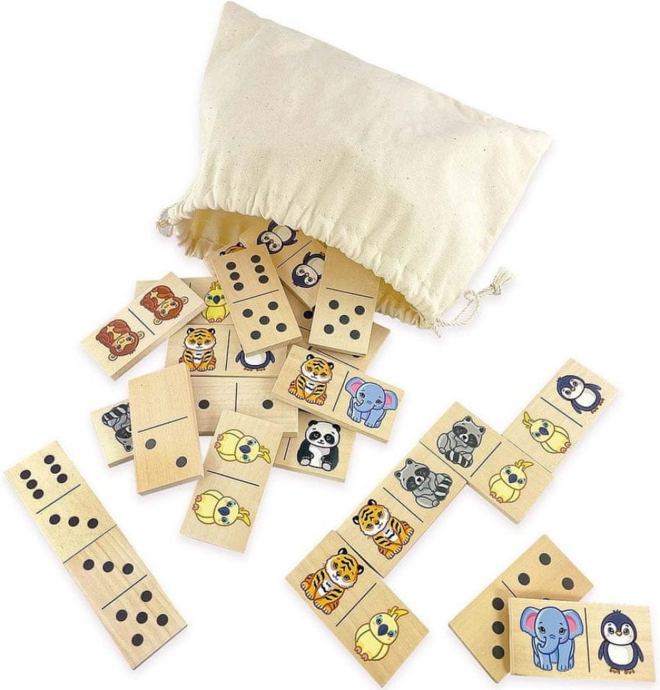 Obsah: 28 oboustranných dřevěných žetonů s potiskem zvířat na jedné straně a klasickými tečkami na straně druhé.