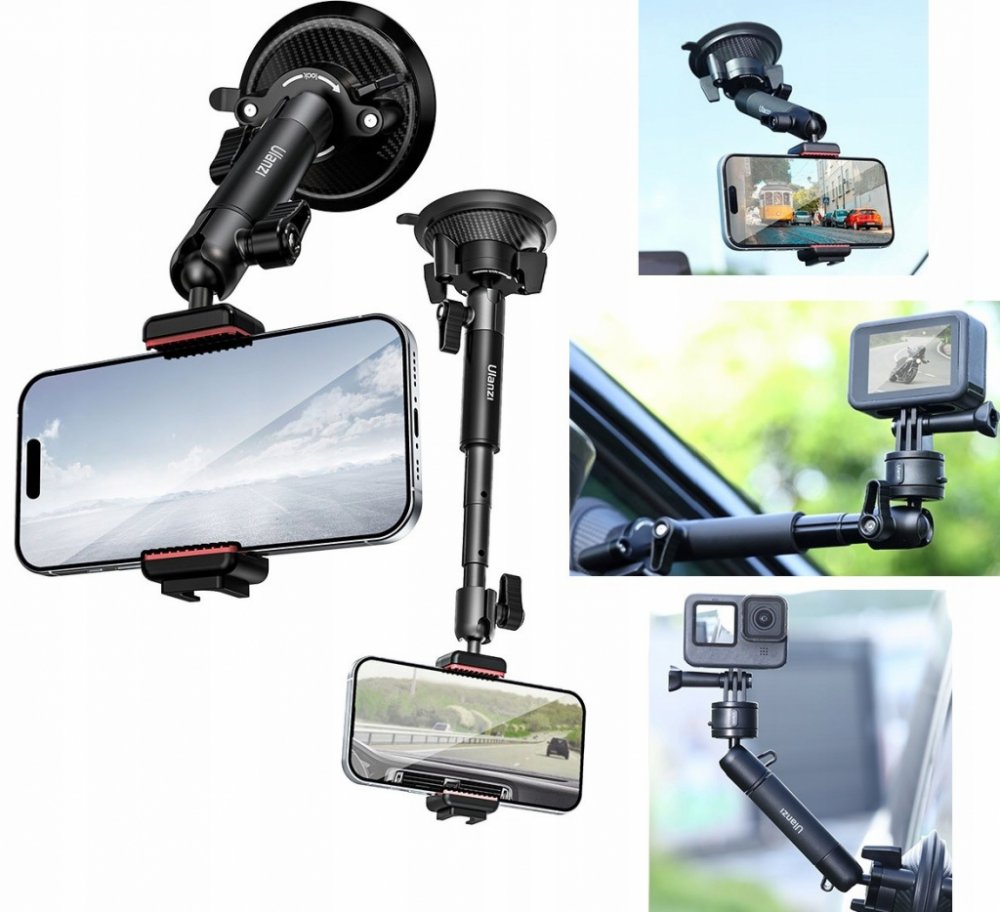 Multifunkční držák / stativ s přísavkou je vynikajícím produktem umožňujícím stabilní připevnění kamery, videorekordéru, telefonu, fotoaparátu na většinu plochých povrchů, jako je sklo auta, motorky, kapota auta, stěna budovy, okno, kovový povrch apod.