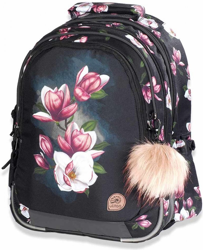 Nový školní batoh s motivem magnólie, který byl vyvinut a vyroben v České republice a je vhodný pro většinu dětí vysokých 134 – 152 cm.