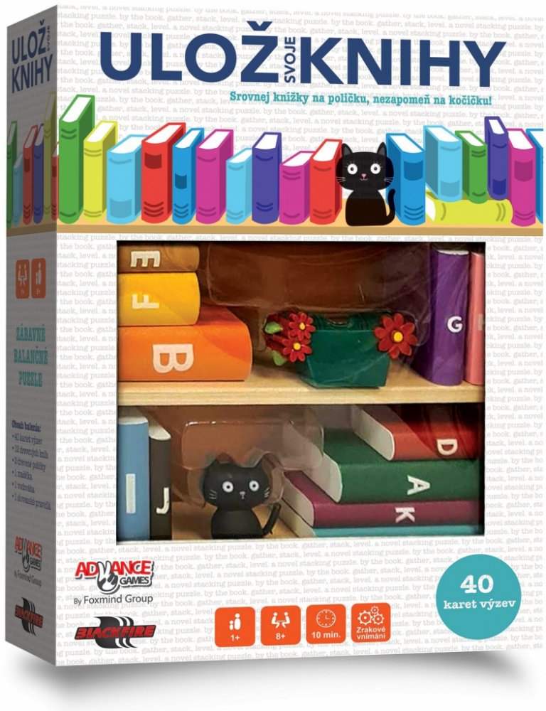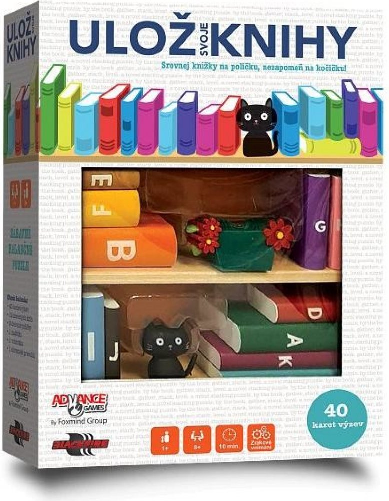 Logické hlavolamy, nejen pro milovníky knih. Srovnej knížky na poličku, nezapomeň na kočičku! Hodně knížek, malá polička, k tomu nezbedná kočička. Udrž své knihy v rovnováze, ať polička nespadne! Tato hra je originálním 3D hlavolamem. Úkolem je uložit až 12 různě velkých knih a jednu chytrou kočičku, která se zde zabydlela, tak, aby byla horní polička v ideální rovině. Neboj, bez nářadí nezůstaneš. Pomůže ti vodováha, která je součástí balení hry. Vyřeš všech 40 hlavolamů a ukaž, že jsi nejlepší ze všech. •Průběh hry 1. Vyberte si kartu výzvy. 2. Jednu z poliček položte na rovný povrch. 3. Vyberte knihy uvedené na kartě výzvy a umístěte je na poličku. Na uložené knihy položte druhou poličku a pomocí vodováhy zkontrolujte, zda je horní polička v rovnováze (bublina vodováhy musí být mezi dvěma středovými čarami). •Pravidla pro ukládání 1. Minimálně dvě knihy se musí dotýkat horní poličky. 2. Některé karty obsahují ikony označující počet knih a/nebo konkrétní knihy, které musíte umístit vodorovně, svisle, nebo jednu na druhou. 3. Když se na kartě s výzvou nachází kočička, musíte ji položit alespoň na jednu knihu, a současně mezi další dvě knihy. Obsah balení: •40 karet výzev •12 dřevěných knih •2 dřevěné poličky •1 kočička •1 vodováha •česká a slovenská pravidla Specifikace hry: •Věk: 8+ •Pro 1 hráče