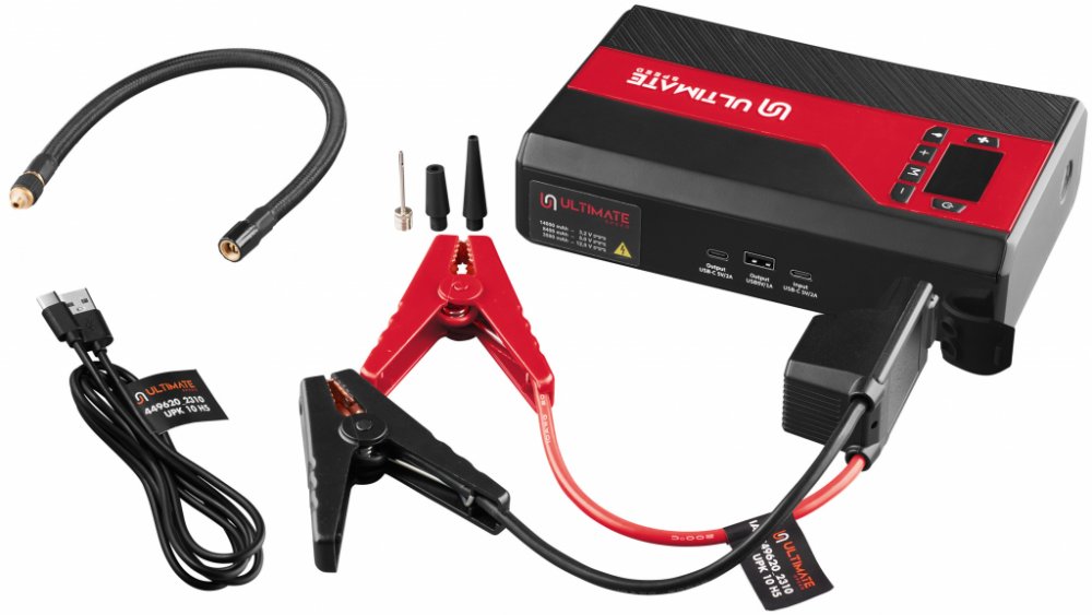 Ultimate Speed® Startovací zdroj s powerbankou a kompresorem UPK 10 H5 Vlastnosti Powerbanka se 4 funkcemi a výkonným Li-Ion akumulátorem (14 Ah / 44,8 Wh) Včetně kompresoru s integrovanou hadicí na stlačený vzduch a digitálním manometrem Startovací zdroj vozidla s okamžitým nastartováním díky vysokému proudovému impulzu krátkodobě až do 200 A (12 V) 2 USB výstupy: 1x Usb-A s 1 A, 1x Usb-C s výstu...