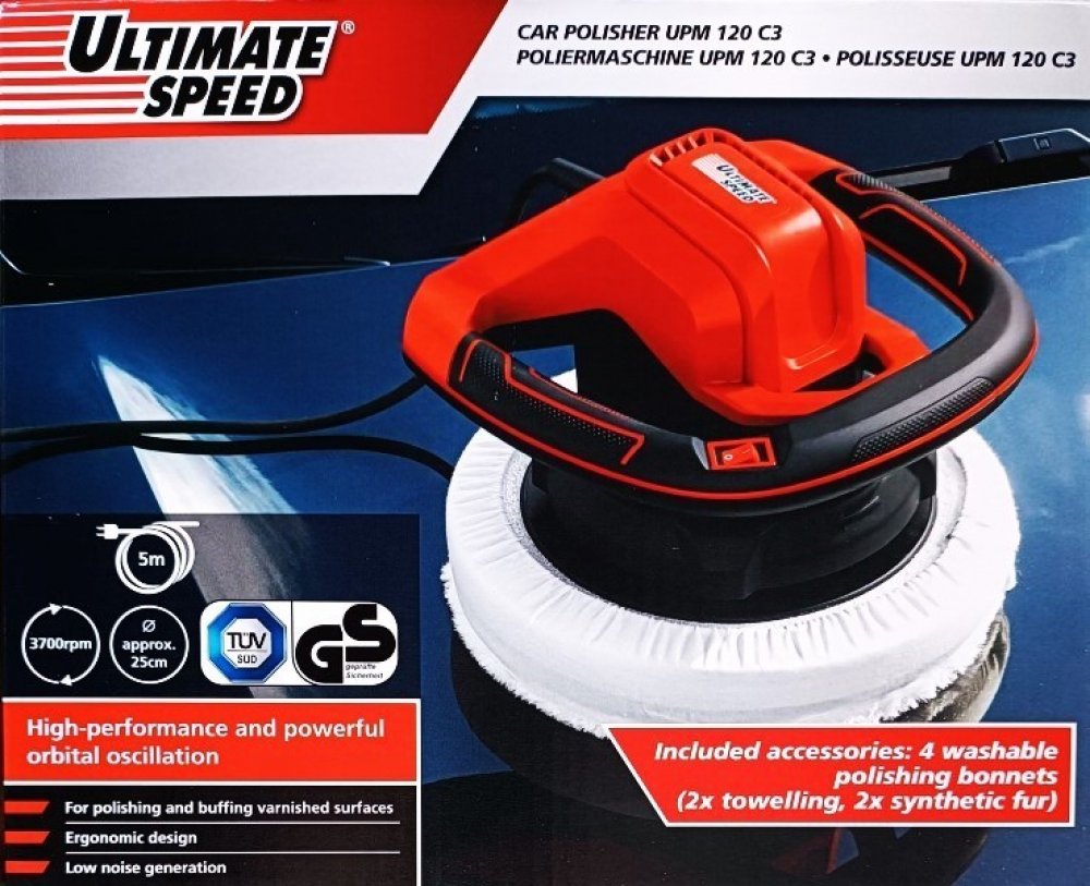 Ultimate Speed UPM 120 C3 je malý leštící stroj, který se skvěle hodí pro amatérské použití. Kvalita provedení se nijak neliší od ostatních modelů. Napájecí kabel o délce 5 m umožňuje volně ovládat zařízení kolem obráběného povrchu. Leštička s příkonem 120 W je ideální pro leštění a voskování lakovaných povrchů.