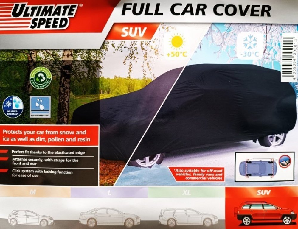 ULTIMATE SPEED Ochranná plachta na auto Chrání před sněhem a ledem, nečistotou, pylem nebo pryskyřicí Optimálně se přizpůsobí tvaru auta díky lemu s gumou Bezpečné upevnění se 2 pásy k přední a zadní části Snadné uchycení díky zacvakávacímu systému s funkcí stahování Odolná povětrnostním vlivům a teplotám od -30 do +50 °C Voděodolná Včetně praktické tašky na uložení Materiál 100 % polyester Rozměry Velikost M: cca 432 x 165 x 120 cm (D x Š x V) Velikost L: cca 480 x 175 x 120 cm (D x Š x V) Velikost XL: cca 534 x 178 x 120 cm (D x Š x V) Velikost SUV: cca 465 x 177 x 144 cm (D x Š x V)
