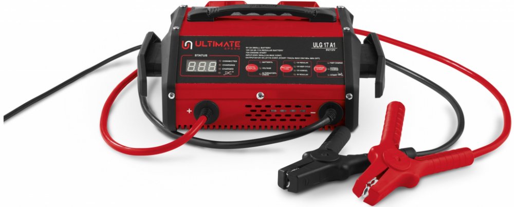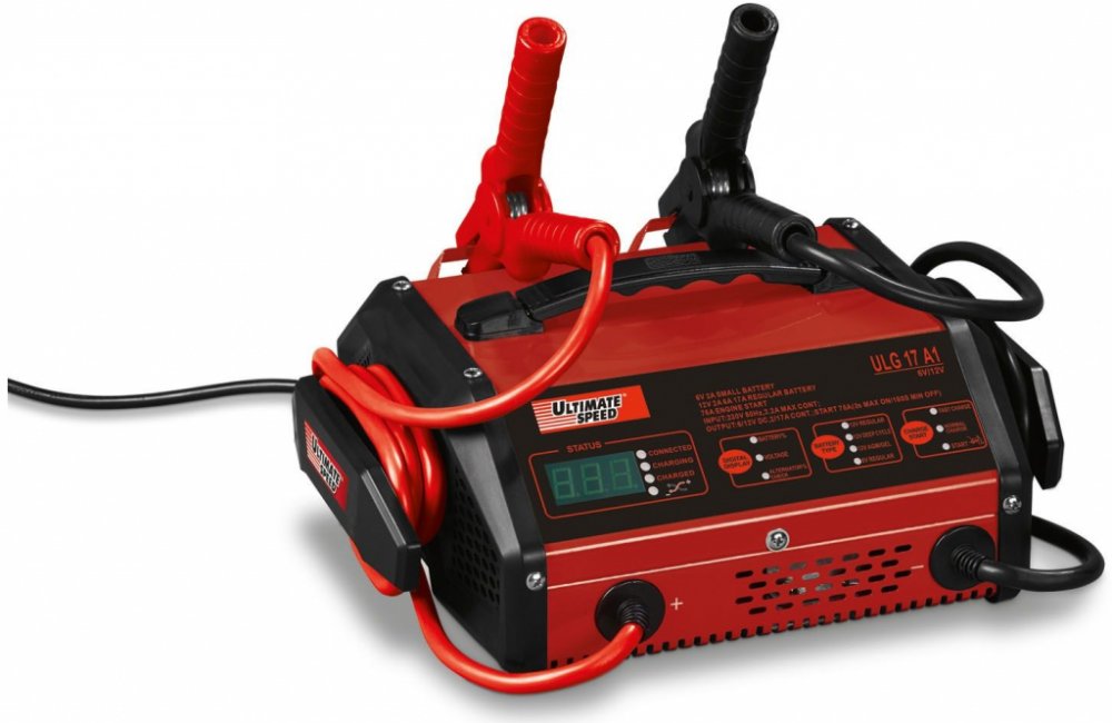 Ultimate Speed® Autonabíječka s funkcí pomocného startování ULG 17 A1 Přímé startování motoru při slabé baterii bez zdlouhavého nabíjení Pro baterie osobních automobilů a motocyklů s 12 V nebo 6 V a kapacitou 8–250 Ah Volba programu pro opětovné nabíjení s optimálním přizpůsobením typu baterie Tester alternátoru pro kontrolu výkonu Ochrana proti přepólování; zkratu a přetížení Inteligentní řízení mikroprocesorem s diagnostickým programem a kontrolovaným nabíjením Teplotní senzor pro přizpůsobení nabíjecí charakteristiky při nízkých teplotách Pulzní nabíjení k oživení vybitých baterií Dlouhodobé připojení na optimální udržení stavu nabití bez tvorby síranů LED displej informuje o výběru programu, zvoleném napětí a stavu nabíjení Automatické rozpoznání baterie s ukazatelem vadné baterie Plně izolované pólové svorky Boční držáky na nabíjecí kabely pro řádné uložení Včetně náhradní pojistky Vhodná pro všechny olovnato-gelové a olovnato-kyselinové baterie Technické údaje Provozní napětí: 230 V ~ 50 Hz Nabíjecí proud: 2 / 6 / 17 A Proudový impuls přímého startování: 75 A / 12 V Rozměry cca 32 x 28,5 x 13,5 cm Délka síťového kabelu: cca 1,8 m Délka nabíjecího kabelu: 2x cca 1,9 m Hmotnost cca 6,5 kg