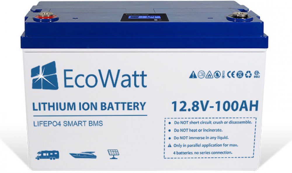 ** Seriální nebo paralelní zapojení, nevyžaduje balancer. Řídící jednotka baterie již obsahuje balanční funkci. - Seriální nebo Paralelní zapojení je bezproblémové. Nominální napětí: 12,8VKapacita 102AhEnergie: 1305WhNabíjecí napětí:14,4–14,6VUdržovací napětí: 13,6VOdpojení zátěže: 11VNabíjecí režim: CC/CV (1 fáze konstantní proud, 2 fáze konstantní napětí)Nominální nabíjecí proud: 50AŠpičkový nabíjecí proud: 100AMax. Vybíjecí proud: 150A (500A/20 sec.)Životnost: >3000cyklů při poklesu kapacity o 0,2C (80% stav nové baterie), >5000cyklů/0,5CSamovybíjení: 3%/měsícMožnost vybíjení až do 0,1C (10% kapacity)Integrovaná nabíjecí automatika (BMS-battery management system) – Bluetooth 4.0teplota při nabíjení: -5° až 45°Cteplota při vybíjení: –20° až 60°Cteplota pro skladování: –5° až 35°COchrana IP: IP65Závit na bateriovém kontaktu: M8Rozměry (DxŠxV): 328×172×212mmHmotnost: 13,5kgCertifikáty: CE , UL , UN38.3 , RoHsVýrobce článku LiFePO4: Ganfeng Lithium