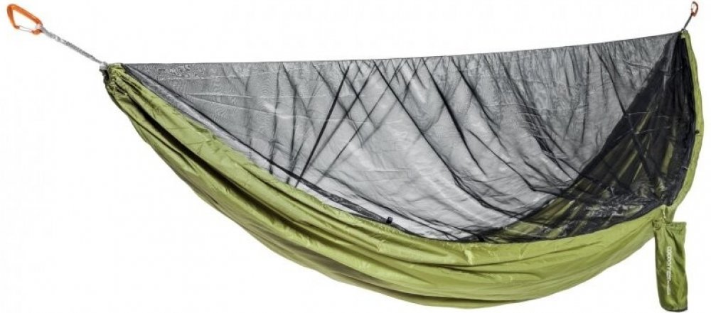 -ultralehká hamaka pro jednoho s maximální nosností 140 kg a zesíleným prošíváním-vyrobeno z lehkého pevného materiálu 20D Hexagonal Ripstop Nylon, který je příjemný na dotek-jemná černá moskytiéra s hustotou 93 otvorů na 1 cm2 s možností plného bočního otevření pomocí YKK zipu-kvalitní high-tech UHMW PE šňůra pro hřebenovou linii, která vyniká odolností proti rázům a odolává oděru-hřebenovou šňůru se používá pro upevnění moskytiéry nebo stříšky-úložný kompresní vak může sloužit zároveň jako držák na drobné doplňky, které chcete mít po ruce-součástí balení jsou dvě hliníkové karabiny 12 KN (hmotnost navíc 40 g) -poutko pro zavěšení hamaky ve sbaleném stavu
