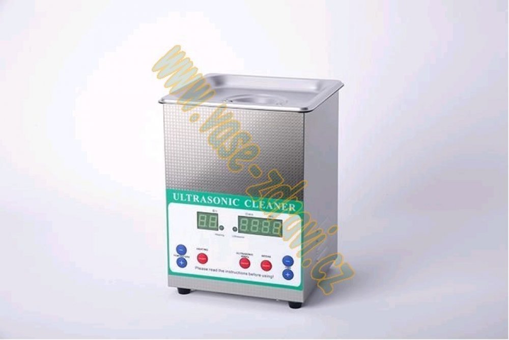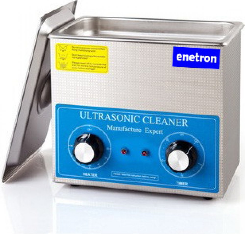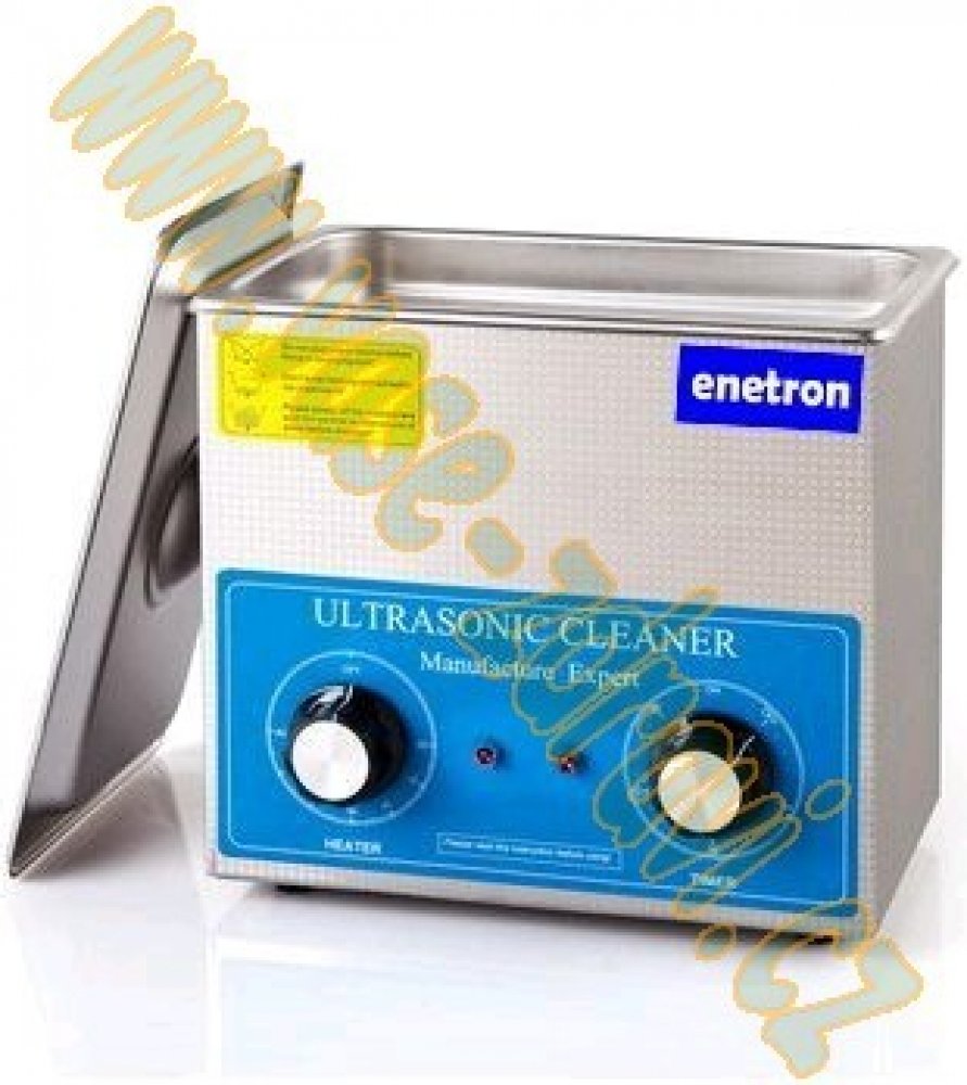 Ultrazvuková čistička ENE III - 3L (název vznikl zkrácením názvu ENETRON) v celonerezovém provedení (nerez SUS304) má mechanické nastavování teploty (20-80°C) a času čištění.