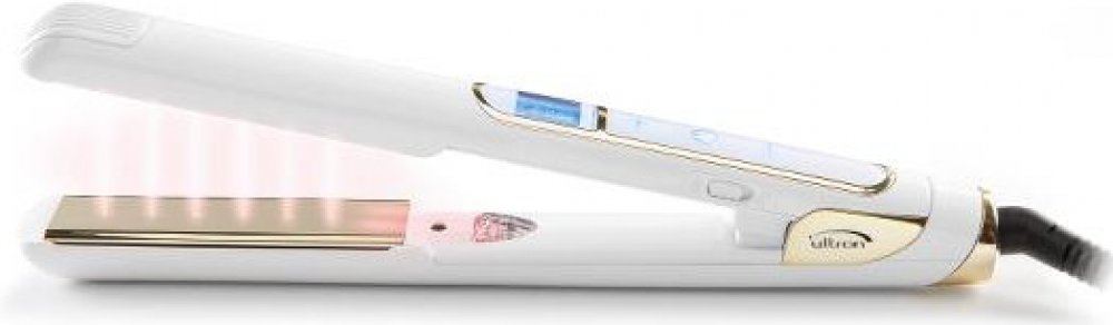 Profesionální žehlička na vlasy Ultron Iku s generátorem iontů a funkcí infrared. Generátor iontů produkuje miliony očisťujících negativních iontů a díky tomu vlasy zůstávají hydratované a dokonale lesklé. Infračervené záření proniká do hloubky vlasů a regeneruje poničenou tkáň. Žehlička se snadno ovládá a skvěle padne do ruky. Na digitálním dotykovém displeji si můžete nastavit teplotu od 120 °C do 230 °C po 10 °C. Displej lze také pomocí bočního tlačítka zamčít. Plovoucí keramické titanové plochy umožňují lepší kontakt s vlasy a výsledkem jsou dlouhotrvající výsledky, zářivé, hebké a zdravé vlasy.Barva: bílá/zlatáTechnologie:Ionizace - negativně nabité ionty jsou částice, které pročisťují vzduch. V přírodě se vyskytují ve velkém množství po bouřce, kdy je vzduch čistší a revitalizující. Generátor produkuje miliony očisťujících negativních iontů, což dodává vlasům odpovídající vlhkost a navrací jim pružnost. Zabraňuje povlávání a elektrizování vlasů. Vlasy získávají přirozený lesk.Infračervené záření - proniká do hloubky vlasů a intenzivně regeneruje poničenou tkáň a stimuluje prokrvení vlasové pokožky. Podporuje tvorbu keratinu, který zlepšuje strukturu vlasů.Vlastnosti:- profesionální žehlička na vlasy- funkce infrared- generátor iontů- nastavitelná teplota 120-230 °C- rychlé zahřátí za 20 sekund na 180 °C- keramicko-titanové žehlící plochy (24 x 100 mm) - nastavení teploty po 10 °C- plovoucí destičky- digitální displej se zámkem- dotykové ovládání- dokonalé hladké vlasy i vlny- pro všechny typy vlasů- dodává hedvábný lesk- vlasy jsou zářivější a zdravější- bez krepatění a statické elektřiny- dlouhotrvající výsledky- 3 m dlouhý otočný kabel- automatické vypnutí po 60 minutách