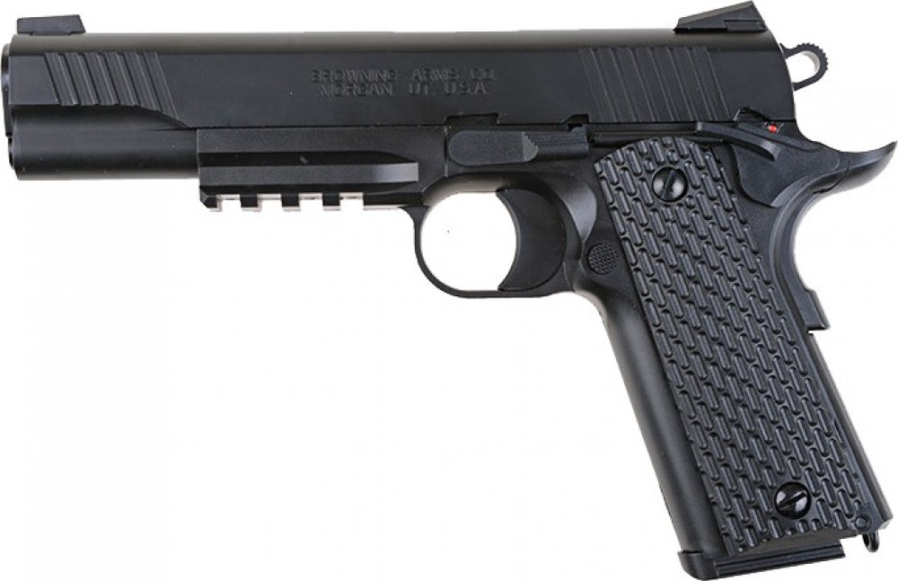 Airsoft Pistole Browning 1911 HME ASG, manuální, Umarex Airsoft Pistole Browning 1911 HME ASG je věrná replika slavné pistole Colt 1911. Pistole má kovový závěr a funkční dlaňovou pojistku, což zajišťuje autentický pocit při střelbě a manipulaci. Pistole je vybavena zabudovaným pevně nastaveným HopUp systémem, který má zásadní vliv na dostřel a přesnost zbraně. Pod hlavní se pak nachází krátký 22...