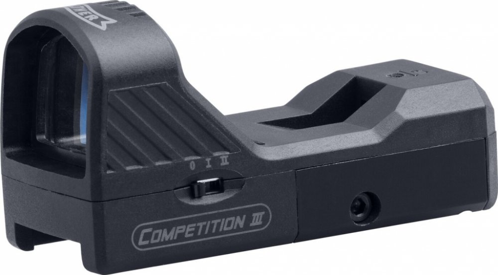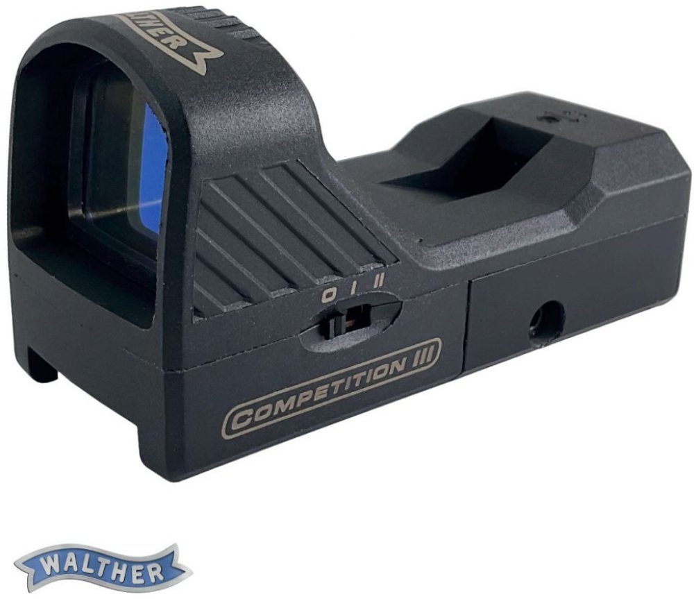 Walther Competition III: větší zelený bod velikosti 10 MOA, dva stupně jasu, integrovaná montáž na lištu weaver, délka 78 mm, hmotnost 58 g. Baterie jsou součástí balení. Vhodné pro airsoft a vzduchové zbraně.