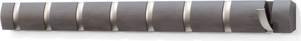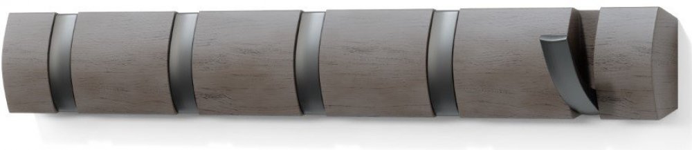 Šedý věšák na oblečení Umbra Flip je masivní, pevně konstruovaná lišta s pěti zlatými a výsuvnými háčky. Je vyroben z plastu a jasanového dřeva. Pokud háček nepotřebujete, jedním pohybem jej sklopíte nahoru. Nenechte se však zmást jeho kompaktním vzhledem, protože Flip pojme překvapivě velké množství předmětů, takže je ideálním místem pro zavěšení kabátů, šál, tašek a dalších věcí pro vás, vaši rodinu a hosty. Díky elegantnímu profilu a skrytému montážnímu prvku se Flip bez problémů připevní prakticky na jakoukoli stěnu a nabízí styl, který vypadá skvěle v každé chodbě. Maximální zatížení 2,3 kg na háček.