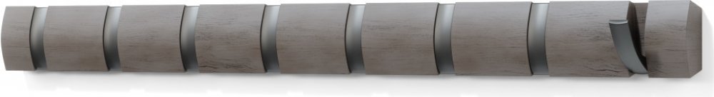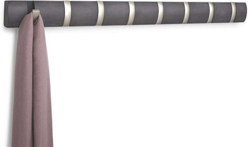 Šedý věšák na oblečení Umbra Flip je masivní, pevně konstruovaná lišta s osmi tmavými a výsuvnými háčky. Je vyroben z plastu a jasanového dřeva. Pokud háček nepotřebujete, můžete jej jedním pohybem sklopit nahoru. Nenechte se však zmást jeho kompaktním vzhledem, protože Flip pojme překvapivě velké množství předmětů, takže je ideálním místem pro zavěšení kabátů, šál, kabelek a dalších věcí pro vás, vaši rodinu i hosty. Díky elegantnímu profilu a skrytému montážnímu prvku se Flip bez problémů připevní prakticky na jakoukoli stěnu a nabízí styl, který vypadá skvěle v každé chodbě. Maximální zatížení 2,3 kg na háček.