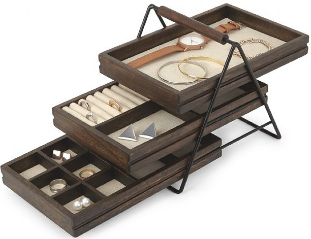 Zásobník na šperky Terrace má tři na sobě umístěné zásobníky s přepážkami optimalizovanými pro uspořádání šperků a jejich bezpečné uložení.