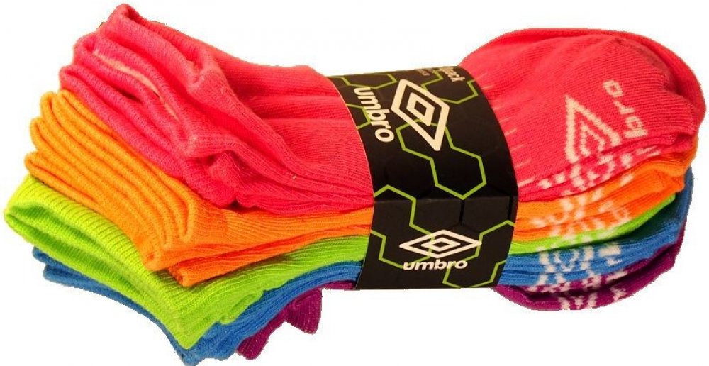 Originální dámské ponožky Umbro v barevách oranžová, růžová, fialová, modrá a zelená. Ponožky mají pružný horní lem, který zabraňuje sklouznutí. Kvalitní značkový výrobek. Ponožky jsou vhodné jak na běžné nošení, tak i na sport. Cenově výhodný 10-ti pack.