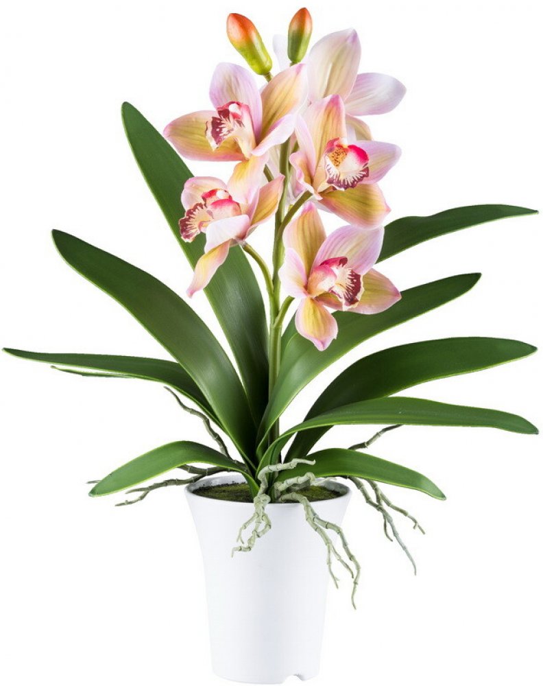 Dekorativní umělá orchidej Cymbidium s půvabnými růžovými květy. Výška umělé květiny včetně květináče je cca 53cm. Květy jsou v různých stádiích květenství. Orchidej má dále v podrostu propracované zelené listy a kořeny. Umělá Phalaenopsis je zasazena do květináče 13,5x15cm. Na pohled a dokonce i na dotek je umělá orchidej Můrovec k nerozeznání od živé květiny.
