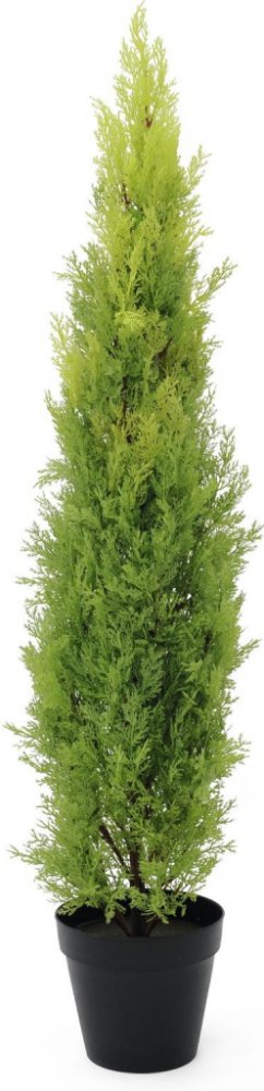 Umělý strom Cypřiš světle zelené barvy je vysoký 120cm včetně květiniče. Stonek, větvičky i lístky jsou dokonale propracované. Díky tomu vypadá tento umělý Cypřiš skutečně jako živý. Vhodné zejména jako elegantní dekorace pro vstupy. Umělý cypřiš je zacementován v černém květináči. Realistické top provedení. Možno umístit i do exteriéru. Cypřiš se vyrábí v několika velikostech.