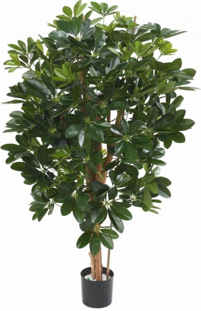 Umělý strom Schefflera je vysoký vč. kotvícího květináče 110cm. Umělá šeflera je vkusnou interiérovou dekorací, která vypadá jako živá. Umělý strom má 3 kmeny z přírodního dřeva a zelené listy s přírodní strukturou z materiálu Tergal. Koruna je rozvětvena do šířky 70cm. Umělý strom šeflera se dodává v kotvícím květináči z PVC (může se lišit od obrázku). Kotvící květináč je určen k vložení do větš...