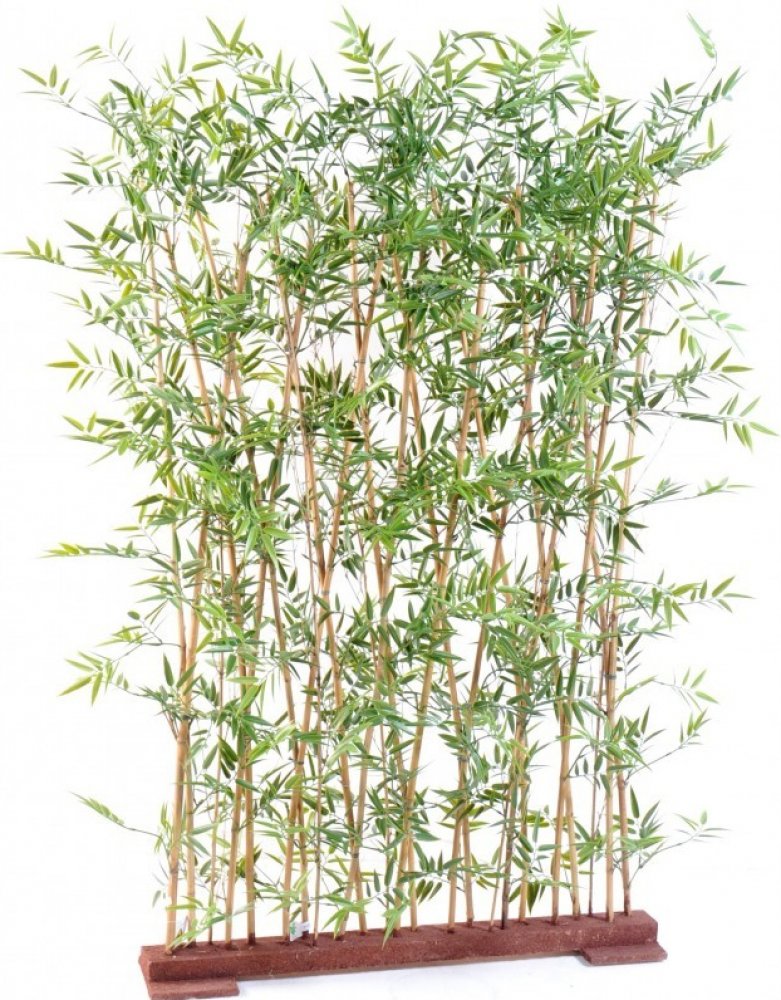 Umělý živý plot v podobě stojanu s přírodními kmeny bambusu a listy z PE. Výška 160cm, délka 110cm, šířka 35cm. Plot má celkem 14 kmenů bambusu které jsou zapuštěny na základně o rozměru 95x18cm. Lze umístít do exteriérů, truhlík musí mít odvod dešťové vody aby základna nezůstávala vlhká. Hmotnost 7,3kg. Lze objednat minimálně 2ks.