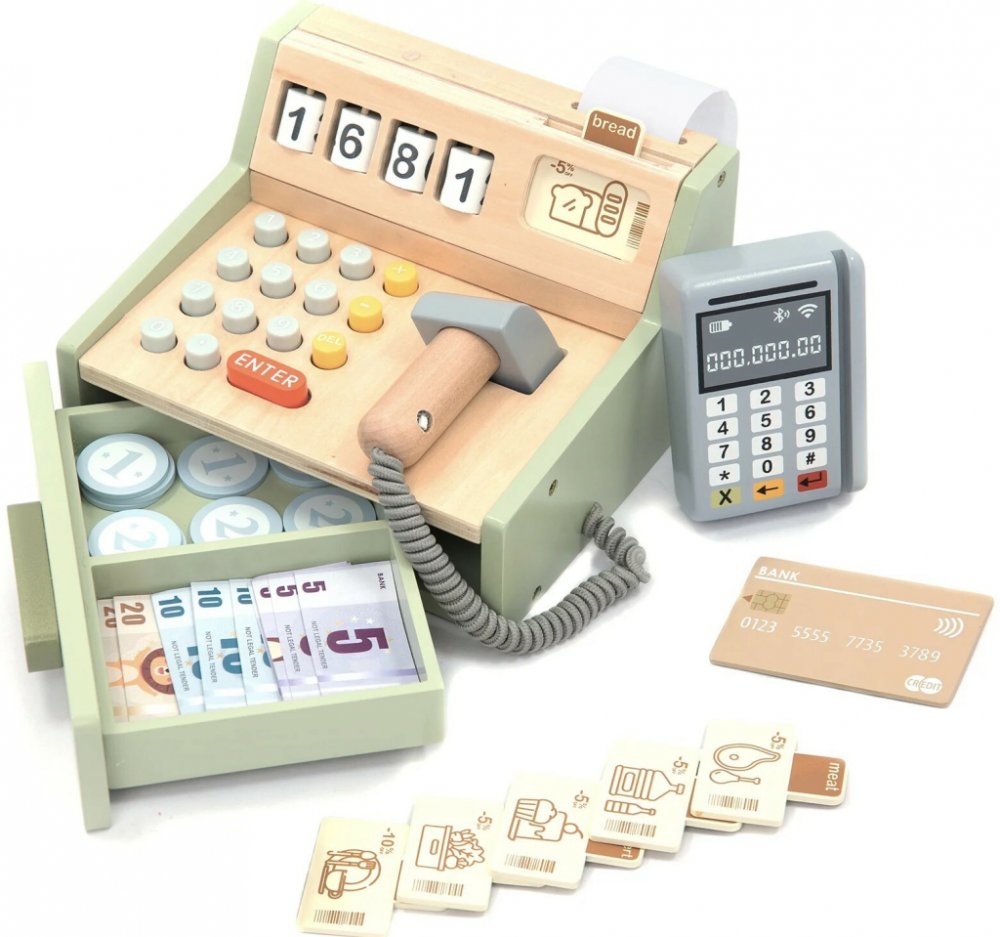 UMU® Dětská pokladnaDřevěná pokladna s příslušenstvím 35 ks Díky kreativní dřevěné sadě UMU® s realistickou pokladnou, penězi, platební kartou a terminálem si děti mohou vyzkoušet roli prodavače i zákazníka. Zažijí tak nanečisto mnohá dobrodružství, které na ně v budoucnu v reálném světě čekají, než se vydají na svůj první opravdový nákup. Klíčové vlastnosti dětské pokladny UMU®Dětská pokladna UMU® pro dívky i chlapceVyrobena z kvalitního dřevaPeníze pro platbu v hotovostiPlatební karty k využití při platbě na platebním terminálu Skener pro snadné načtení zbožíVýsuvný šuplík pro uschování penězHra na obchod se stane oblíbenou činností vašich dětíSeznámení se základy počítání penězProcvičování se ve sčítání, odčítáníZvládnutí rozlišování hodnot penězZáklady finační gramotnosti nejmenšíchRozvoj dětské fantazie a zábava na celé hodinyJe ideální pro děti ve věku od 3 let Přírodní materiály...