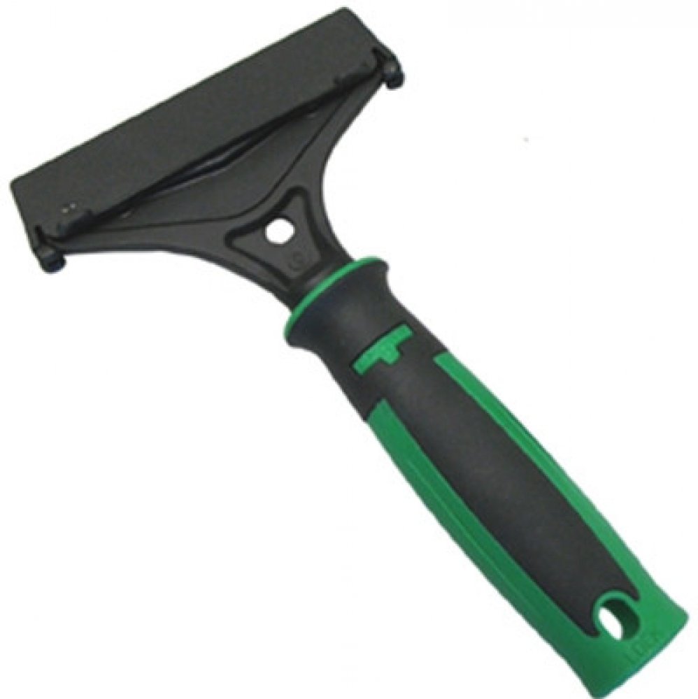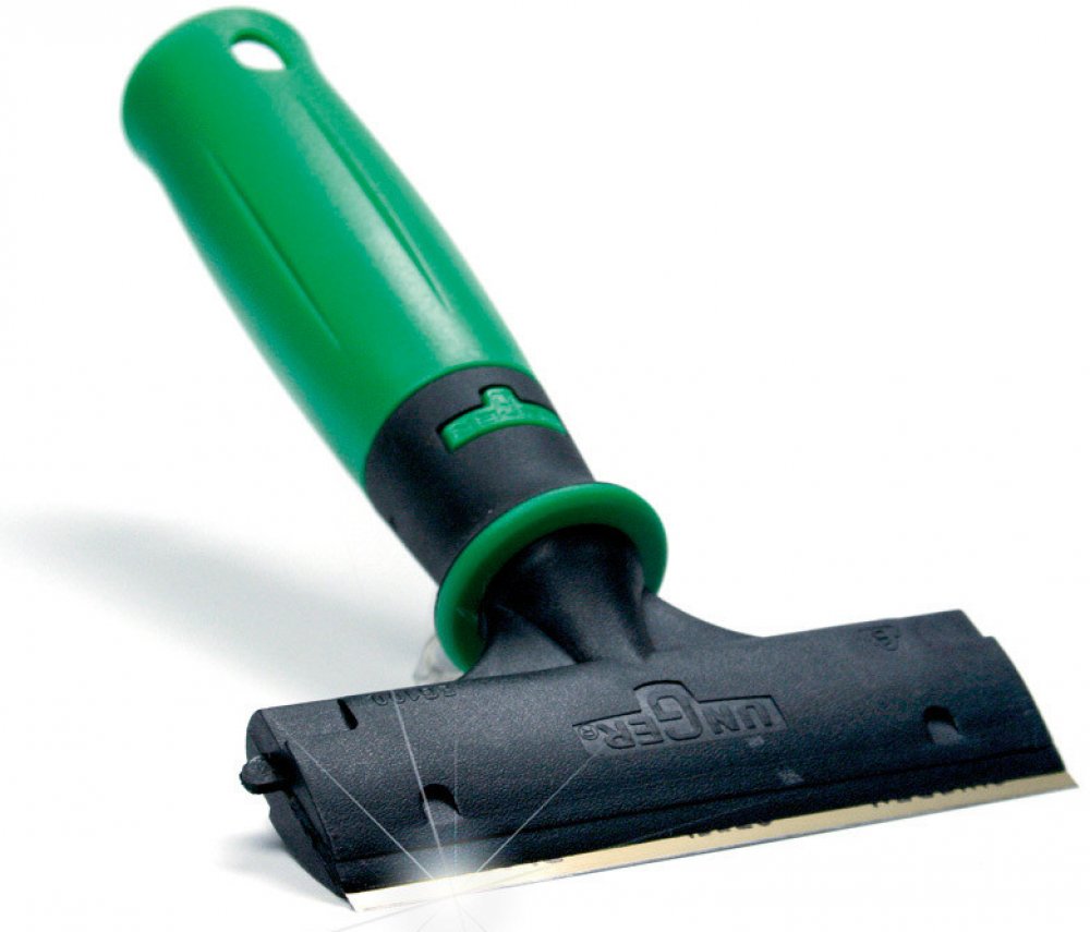 Škrabka s dvoustrannou čepelí. Obě strany jsou perfektně ostré a určené k odstraňování různých samolepek a podobných nečistot ze skla okna. Odolná a lehká škrabka s ergonomicky tvarovaná rukojeť navržená tak, aby dokonale padla do ruky. Součástí škrabky je bezpečnostní kryt čepele. Škrabka je osazena jednou výmněnou žiletkou. Pracuje se s ní v ruce nebo na tyči UNGER.