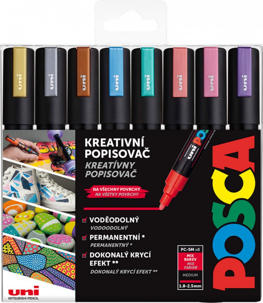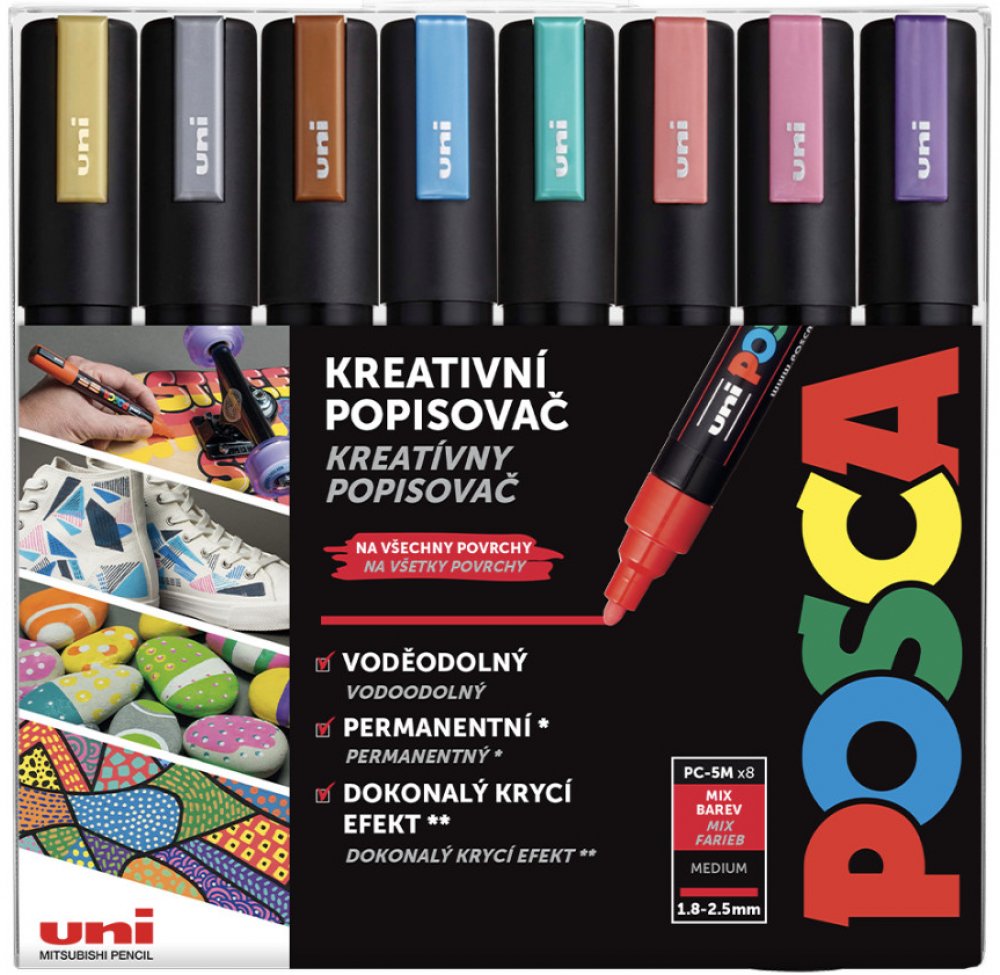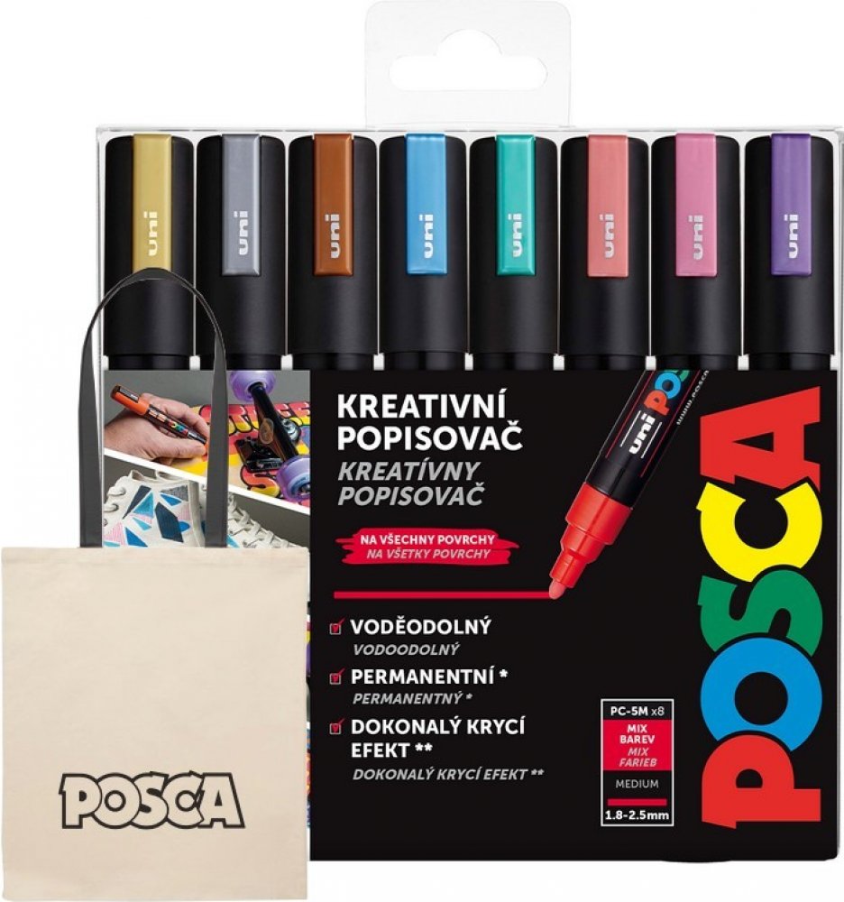Sada Akrylových popisovačů 2,5 mm v dárkovém balení v dřevěné krabiččce, kterou jsme pro Vás vyrobili, zavíraní na magnety. Tuto dárkovou krabičku si můžete vybarvit a popsat, dle Vaší fantazie. Sada obsahuje 8 ks popisovačů se stejnými vlastnostmi jako ostatní barevné popisovače Posca. Nepostradatelný popisovač se střední velikostí hrotu je „víceúčelový“ člen řady Posca. Vytvoří elegantní a přesné linie a je ideální pro vybarvování. Oblíbený jak profesionály, tak začátečníky. Tl. linky: 1,8–2,5 mm střední, hrot: polyester/kulatý, tělo: plast (PP). Obsahuje bezkonkurenční inkoust, jehož složení se od svého vytvoření nezměnilo, je mimořádně bohatý na pigmenty a je extrémně odolný vůči atmosférickým podmínkám a plynutí času. Jeho matné barvy mají velkou hloubku - umělci je milují pro svá díla a fandové jsou ohromeni „magickým“ efektem Posca. Obsahuje jedinečný ventilový mechanismus, který zaručuje perfektní utěsnění a šetří barvu v průběhu času. Stejný mechanismus se používá k naplnění popisovačů Posca pro použití a k opětovnému nasycení špičky tak často, jak je to nutné během tvoření. Barva je velmi bohatá na pigmenty, čímž vykazuje výsledky vynikající hustoty. Jeho jedinečné složení na vodní bázi poskytuje jasné, matné, neprůhledné barvy, které opravdu vydrží. Je bez zápachu. Barvy jsou vrstvitelné, mísitelné, vodou rozpustné, odolné vůči povětrnostním vlivům a nabízejí neomezené kreativní možnosti. Vyrobeno v Japonsku.