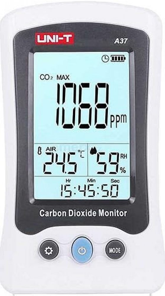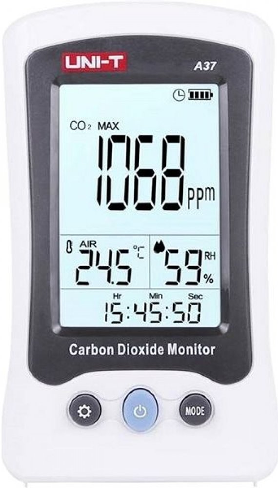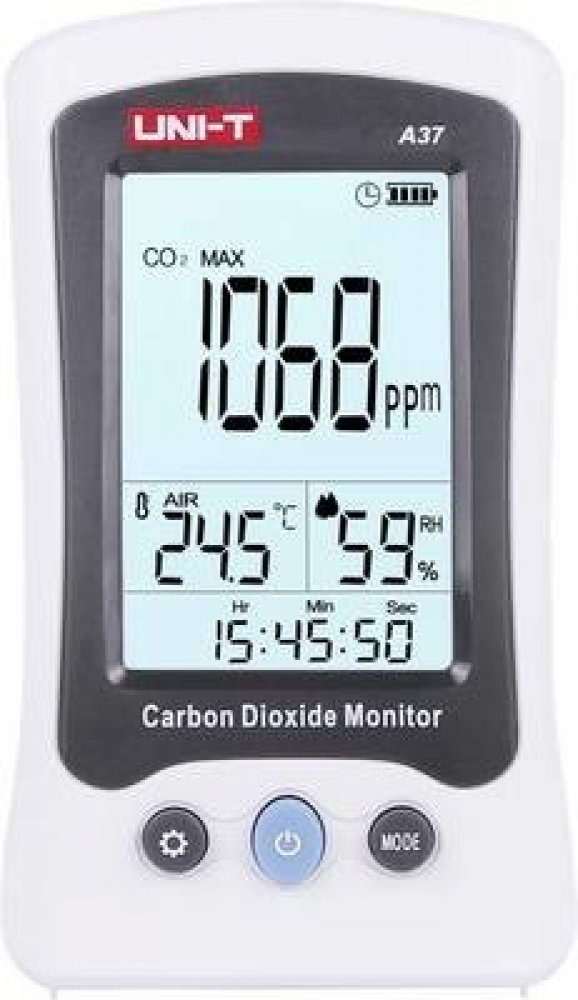 A37 monitoruje množství oxidu uhličitého, teplotu a relativní vlhkost vzduchu. Tento přístroj může být široce používán v domácnostech, kancelářích, vozidlech, laboratořích, kancelářích, hotelech, školách, továrnách, konferenčních místnostech, na letištích, v nemocnicích, restauracích, nákupních centrech a na mnoha dalších veřejných místech. Rozsah měření CO2 je od 400ppm (0,04%) do 5000ppm (0,5%). Přístroj má automatickou kalibraci CO2 a hodnotu CO2 následně měří 1x za 3 sekundy a má možnost nastavení systémového času a data. Pak lze pomocí krátkého stisknutí tlačítka MODE zobrazit pozastavená dat (HOLD), nebo maximální a minimální (MAX a MIN) hodnoty, nebo průměrné hodnoty (AWG), nebo průměrné vystavení osob CO2 na pracovišti během 8hodinového pracovního dne nebo 40hodinového pracovního týdne (funkce TWA), nebo přijatelný limit vystavení CO2 po krátkou dobu (časově vážený průměr), obvykle 15 minut (funkce STEL). Hodnoty CO2 se indikují také v šesti úrovních pomocí emotikonů.