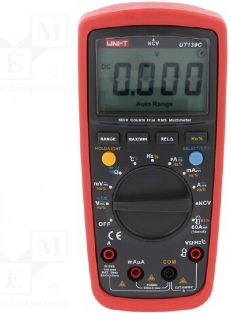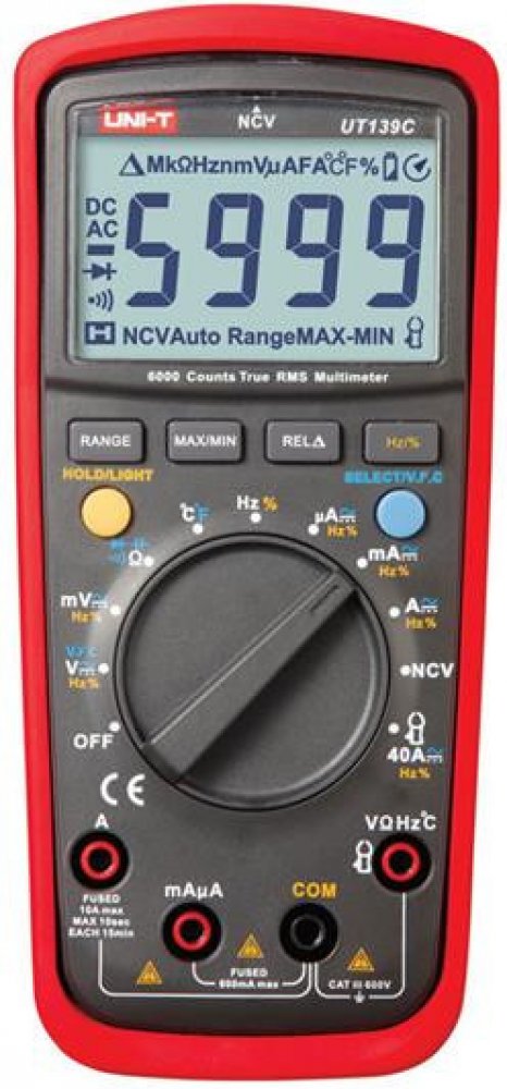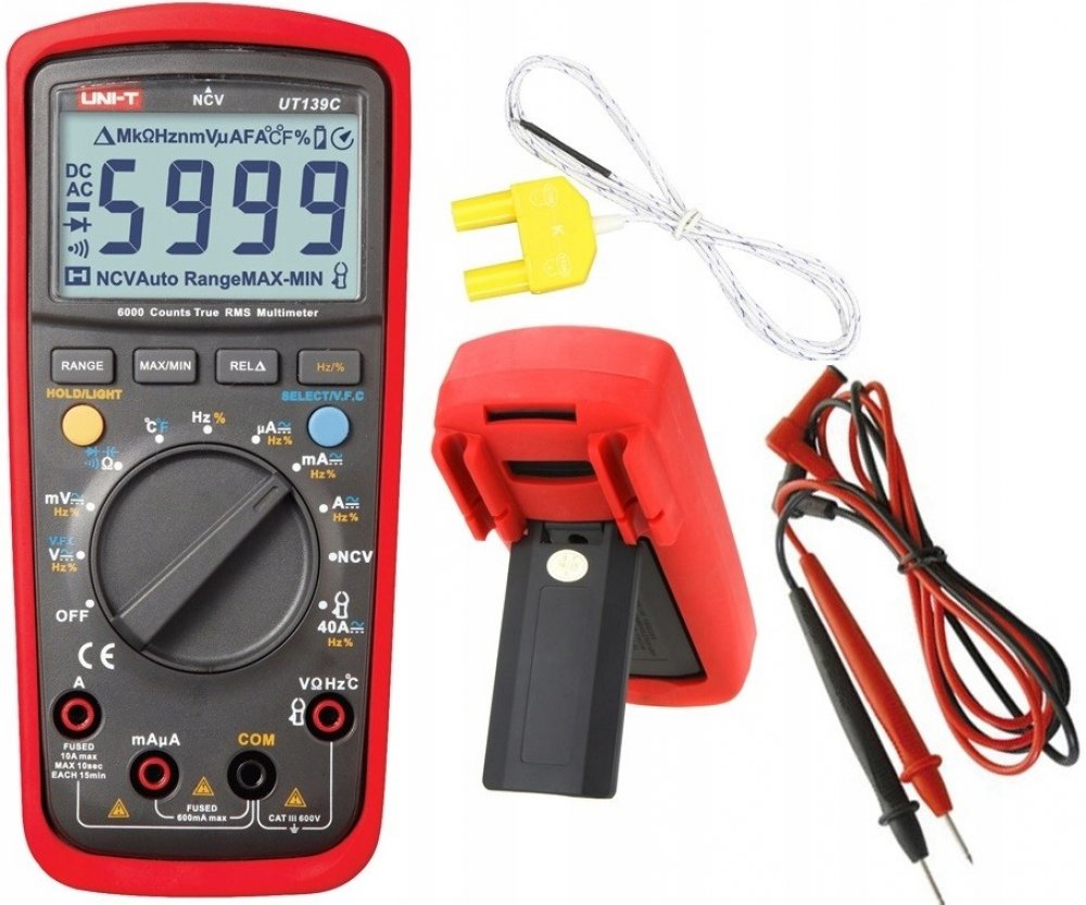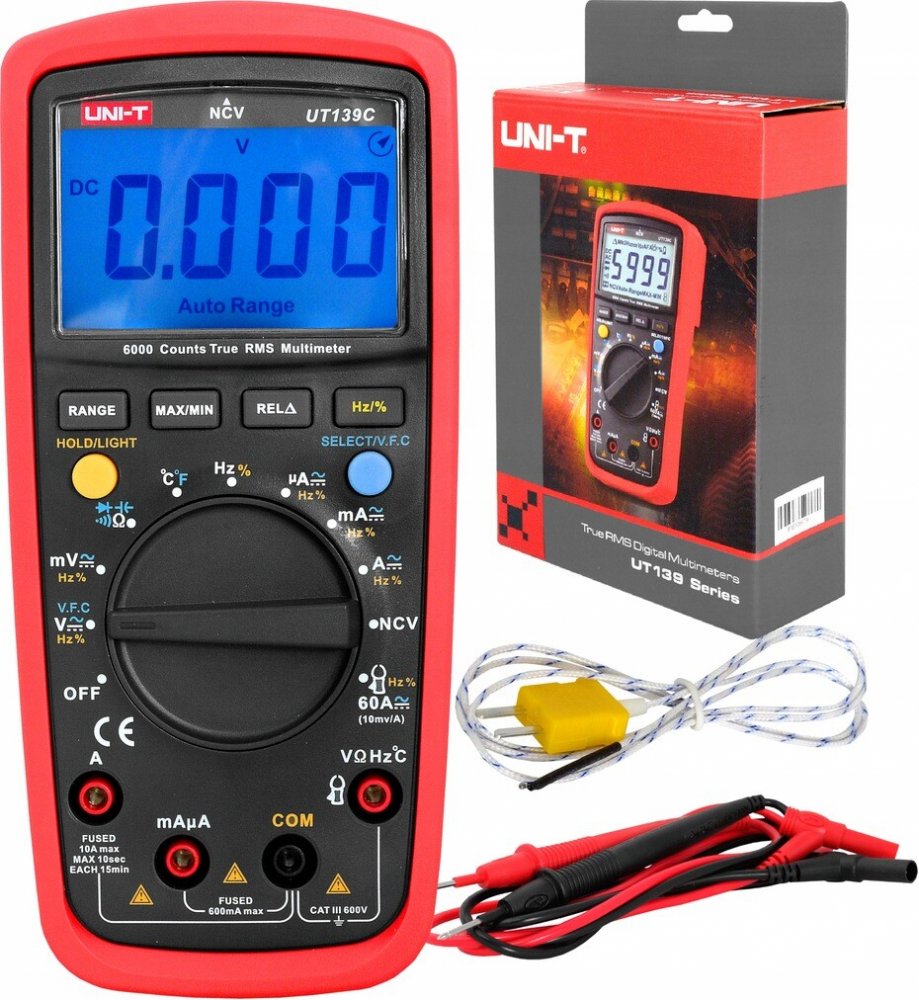 Multimetr UNI-T UT139C je nový profesionální multimetr s klasifikací True RMS a ochranou CAT III 600V, navržen pro potřeby elektrikářů pro měření distribučních sítí nn v budovách. Inovativní a industriální design s ochranným pouzdrem zaručuje odolnost multimetru proti nárazu. Přístroj obsahu