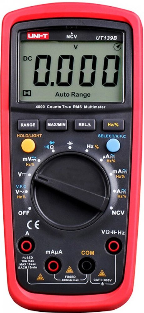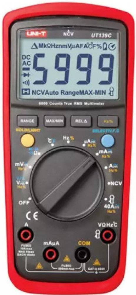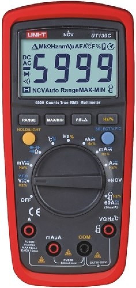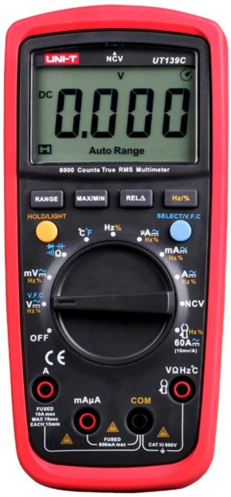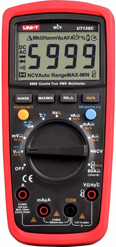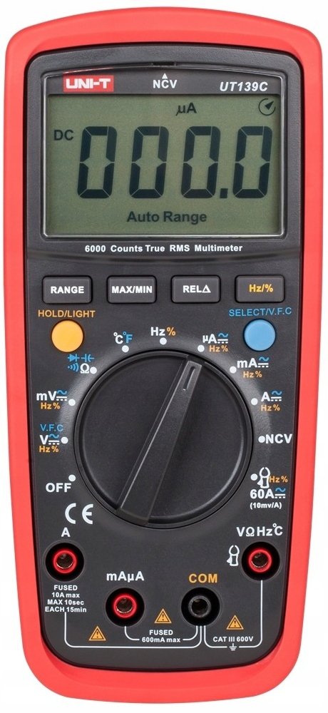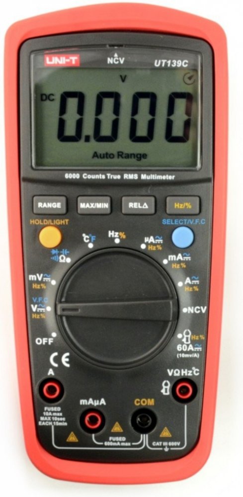 Multimetr UNI-T UT139C je nový profesionální multimetr s klasifikací True RMS a ochranou CAT III 600V, navržen pro potřeby elektrikářů pro měření distribučních sítí nn v budovách. Inovativní a industriální design s ochranným pouzdrem zaručuje odolnost multimetru proti nárazu. Přístroj obsahuje řadu nadstandardních funkcí, jakými jsou např. měření napětí s nízkou impedancí (LoZ) (u variant UT139E + UT139S), měření napětí s proměnnou frekvencí (VFC) (u variant UT139E + UT139S), bezkontaktní měření napětí (NCV), měření kapacity kondenzátorů, měření poměru frekvencí, nebo také měření teploty. Velký a přehledný LCD TN podsvětlený displej zaručuje dokonalejší zobrazení naměřených hodnot. Rozsah zobrazení displeje je ±6,000, u kapacity a frekvence 9999. Obnovovací frekvence 2 až 3 krát za vteřinu. Jištění proudových rozsahů je provedeno trubičkovými tavnými pojistkami (rozsah 10A pojistkou FF 10A H/600V (6 x 25mm); rozsah mA/µA pojistkou FF 600mA H/600V (6 x 32mm)). Napájení multimetru je provedeno dvěma alkalickými bateriemi AA 1,5V. Rozsah měření veličin lze volit automaticky, i manuálně. Součástí balení jsou měřící kabely s hroty, termo sonda s článkem typu K a také baterie.