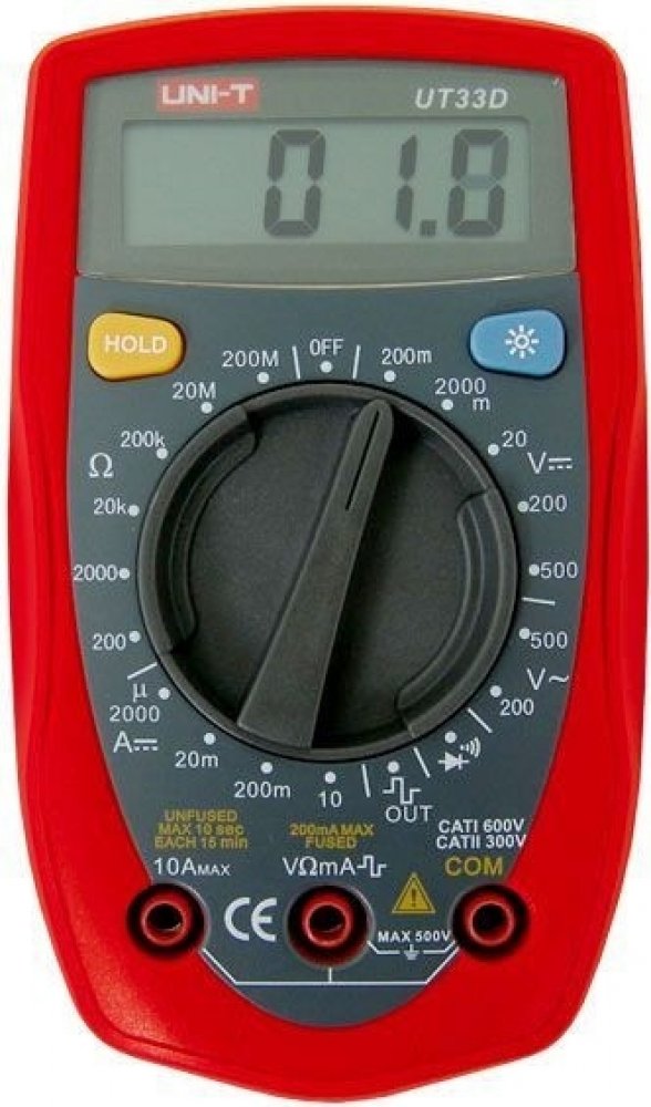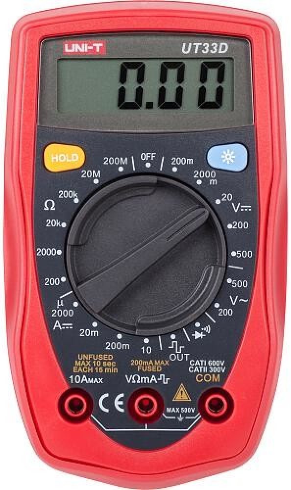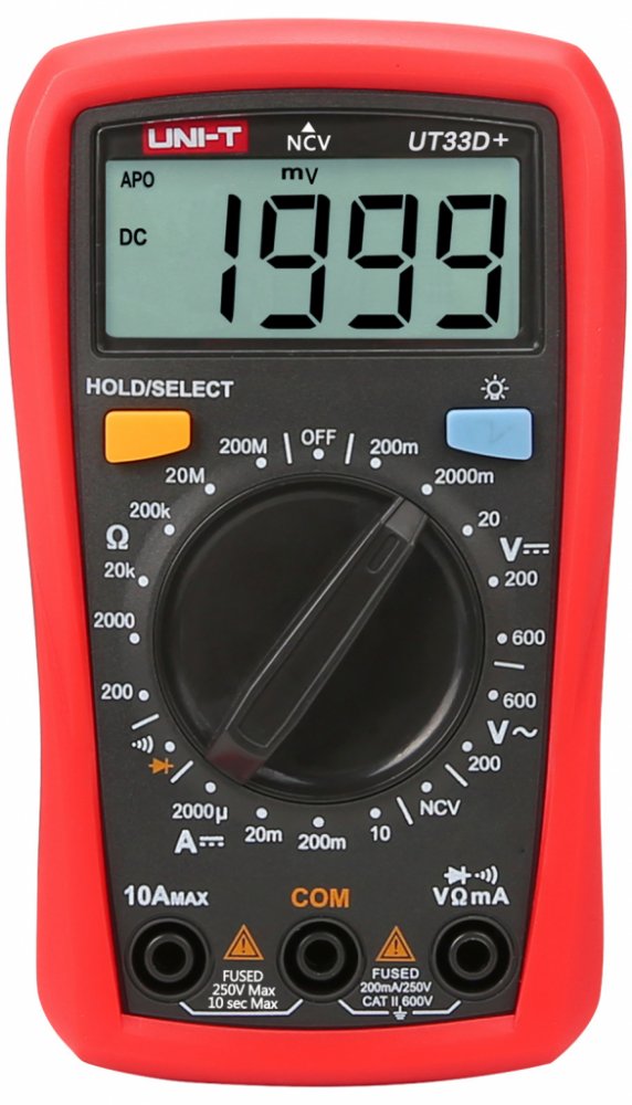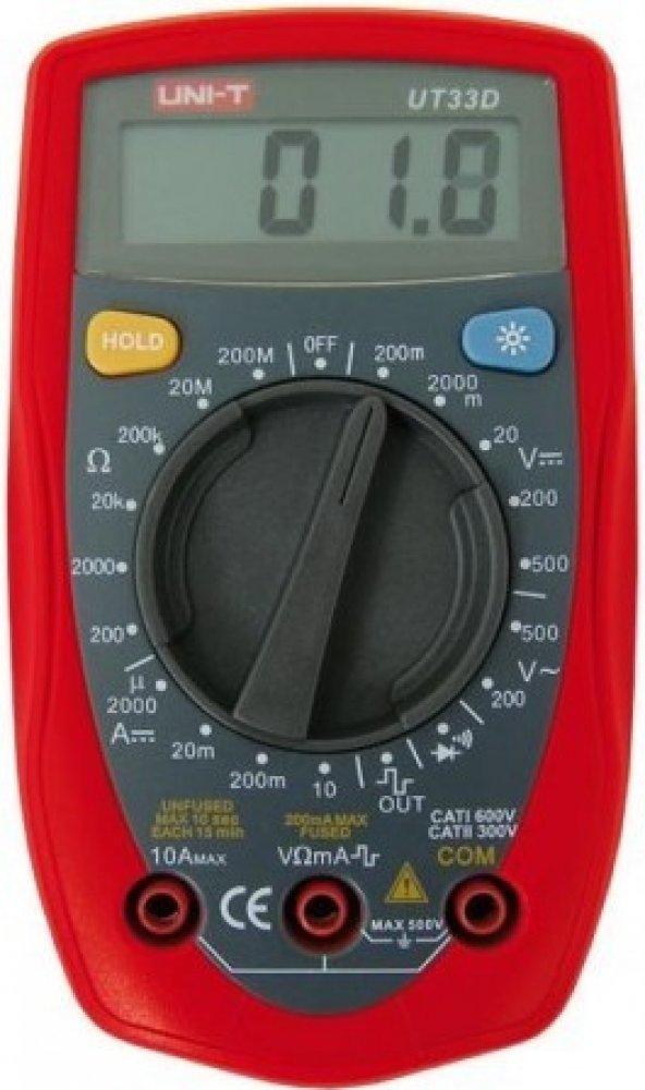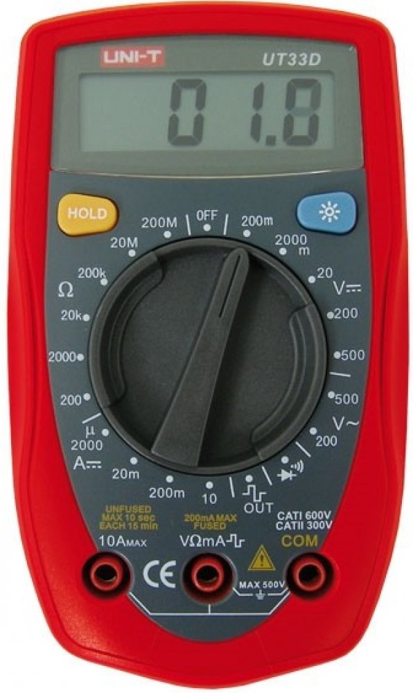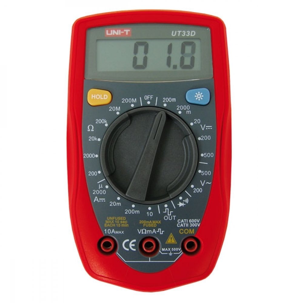 Multimetr UNI-T UT33D je malý, ale přesto bezpečný přístroj vhodný do malé dílny a do každé domácnosti. Kromě běžného měření napětí, proudu a odporu má rovněž zabudovaný generátor obdelníkového signálu. Kvalitní provedení, bezpečnost a jednoduché použití jsou hlavní výhody tohoto multimetru se skvělým poměrem cena/výkon.