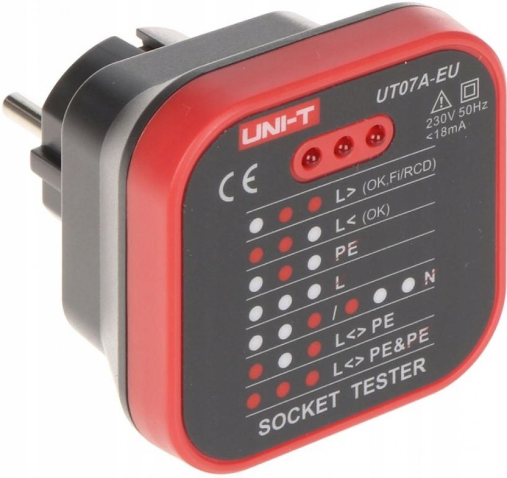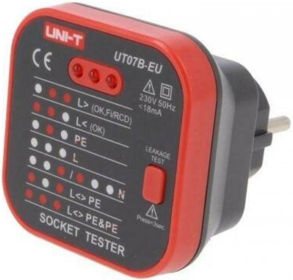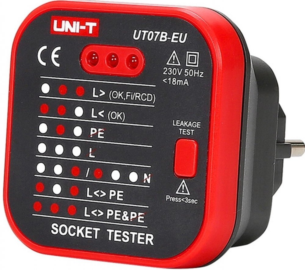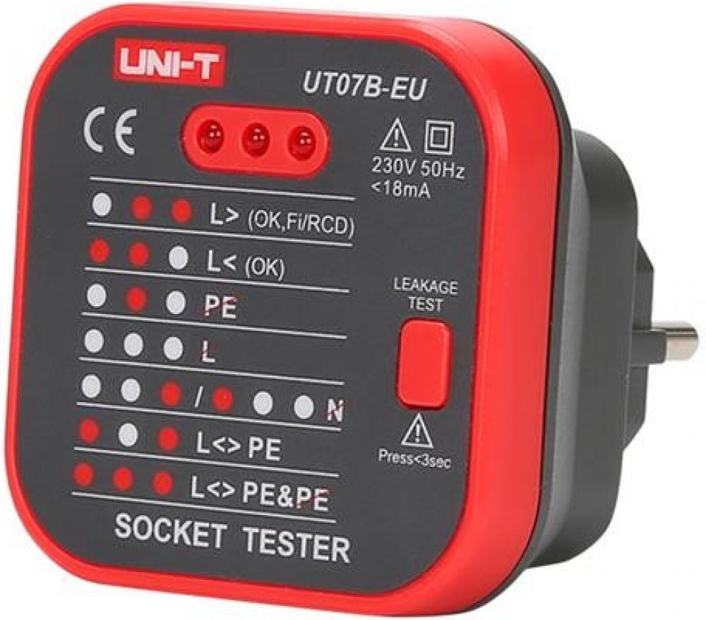 Přístroj UNI-T UT07B-EU je tester pro jednoduchou kontrolu zapojení zásuvek 230V/AC. Pomocí tří kontrolních diod LED signalizuje správné připojení všech tří vodičů rozvodu a funkčnost zapojení proudového chrániče.