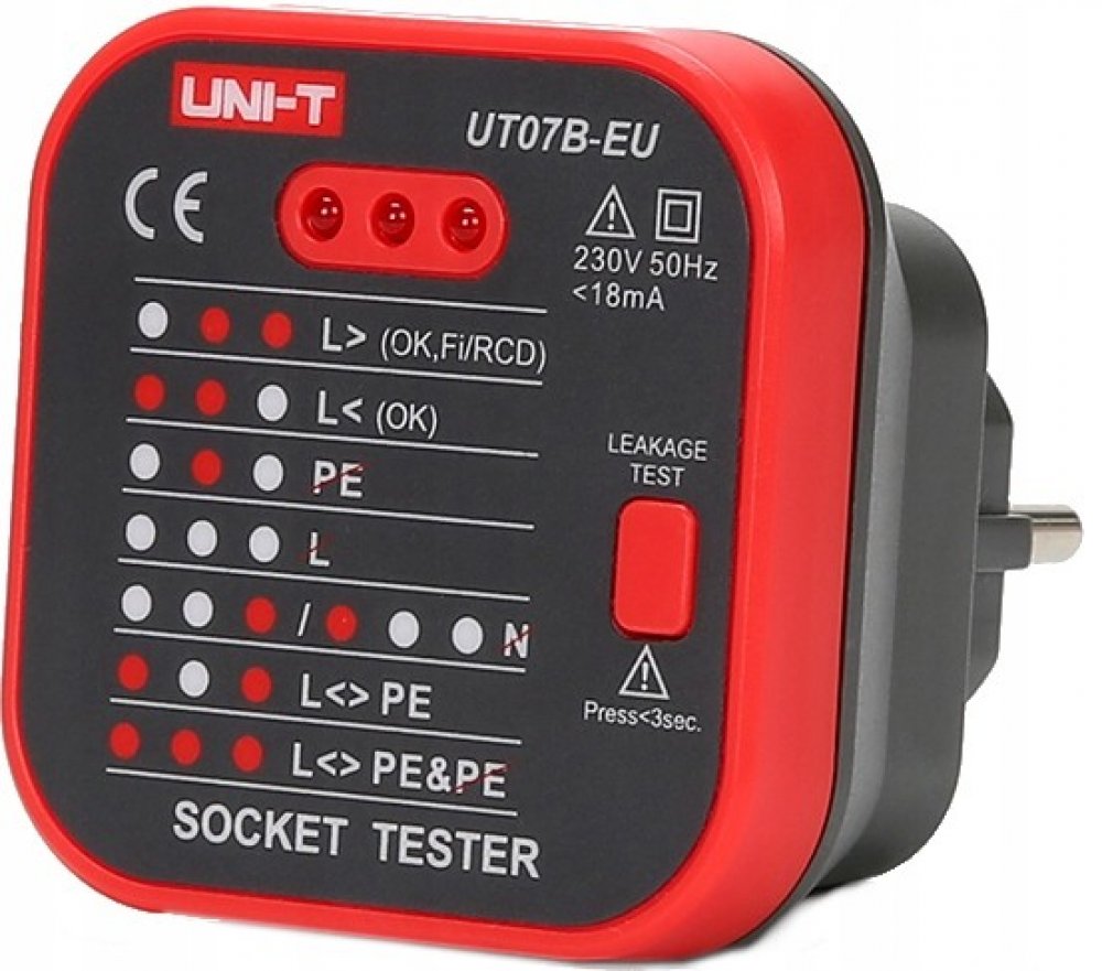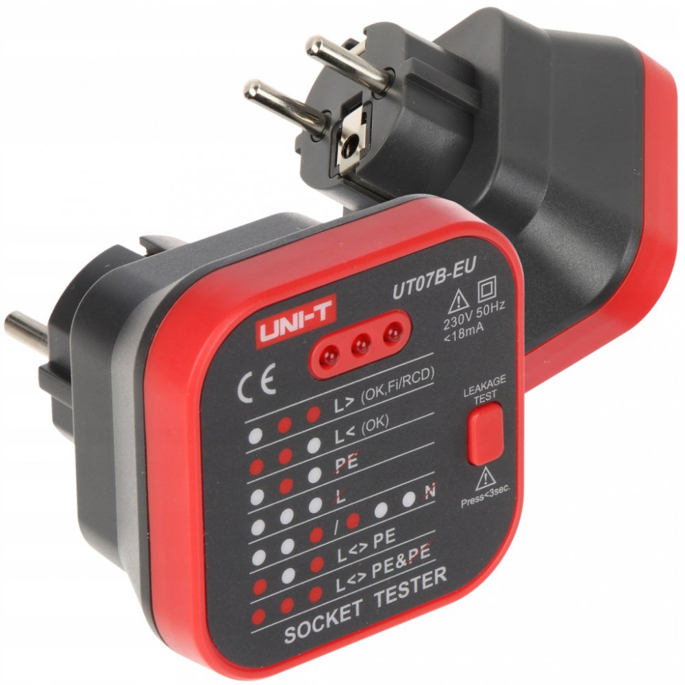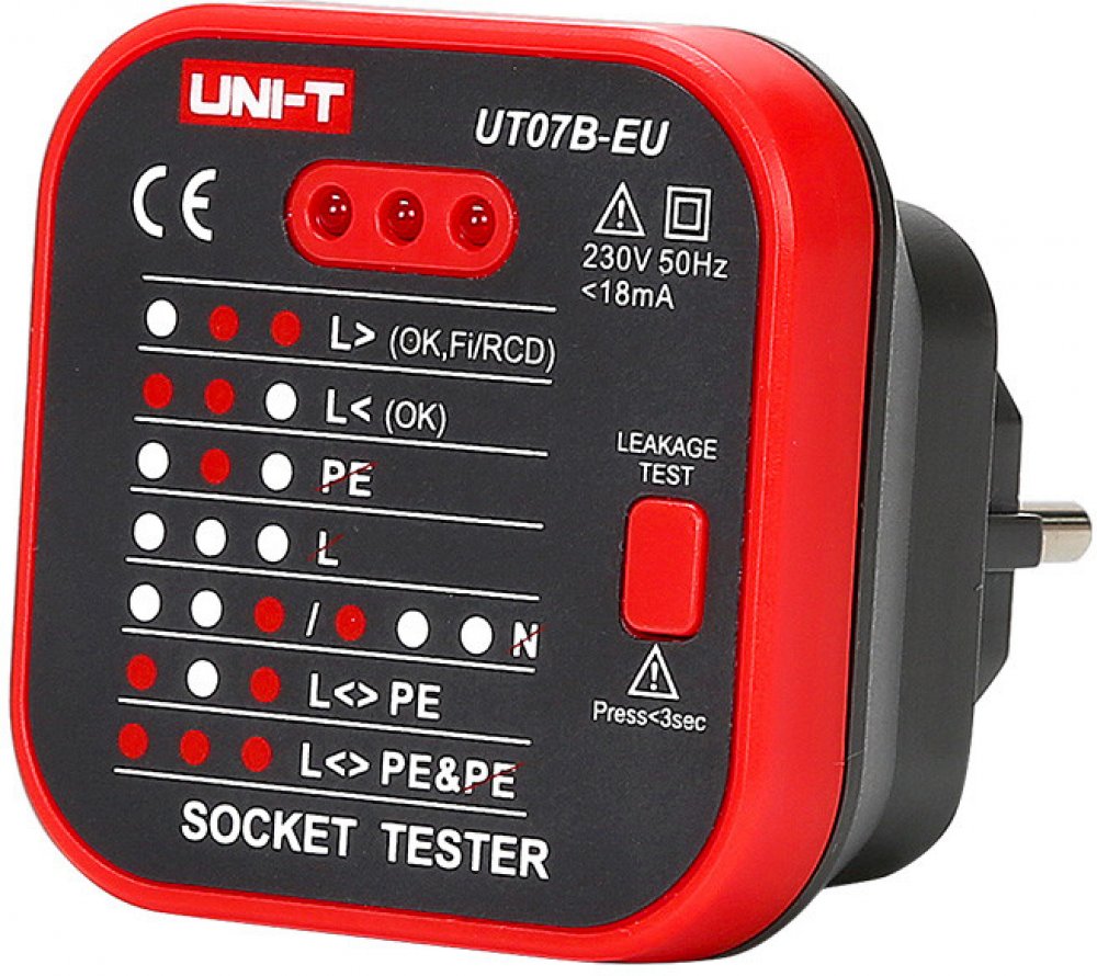 Přístroj UNI-T UT07B-EU je tester pro jednoduchou kontrolu zapojení zásuvek 230V/AC. Pomocí tří kontrolních diod LED signalizuje správné připojení všech tří vodičů rozvodu a funkčnost zapojení proudového chrániče.