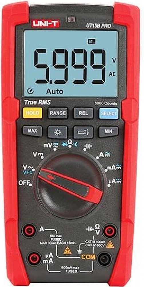 Digitální multimetr UT15B PRO 1000 V True RMS je vysoce spolehlivý, bezpečný a odolný multimetr, měřící skutečné hodnoty RMS, určený i pro měření v rozvodných zařízeních kategorie CAT III 1000 V / CAT IV 600 V. Multimetr je vybaven vestavěným filtrem VFC a dokáže odfiltrovat rušení vznikající například na měničích napětí, což vede k přesnějšímu odečtu napětí.